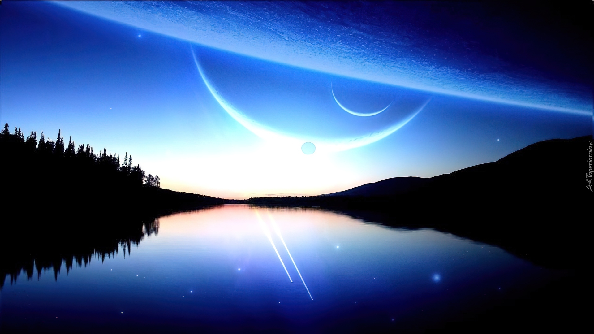 Edytor tapety: Piękny, Las, Jezioro, Gwiazdy, Planety, Noc, Światło