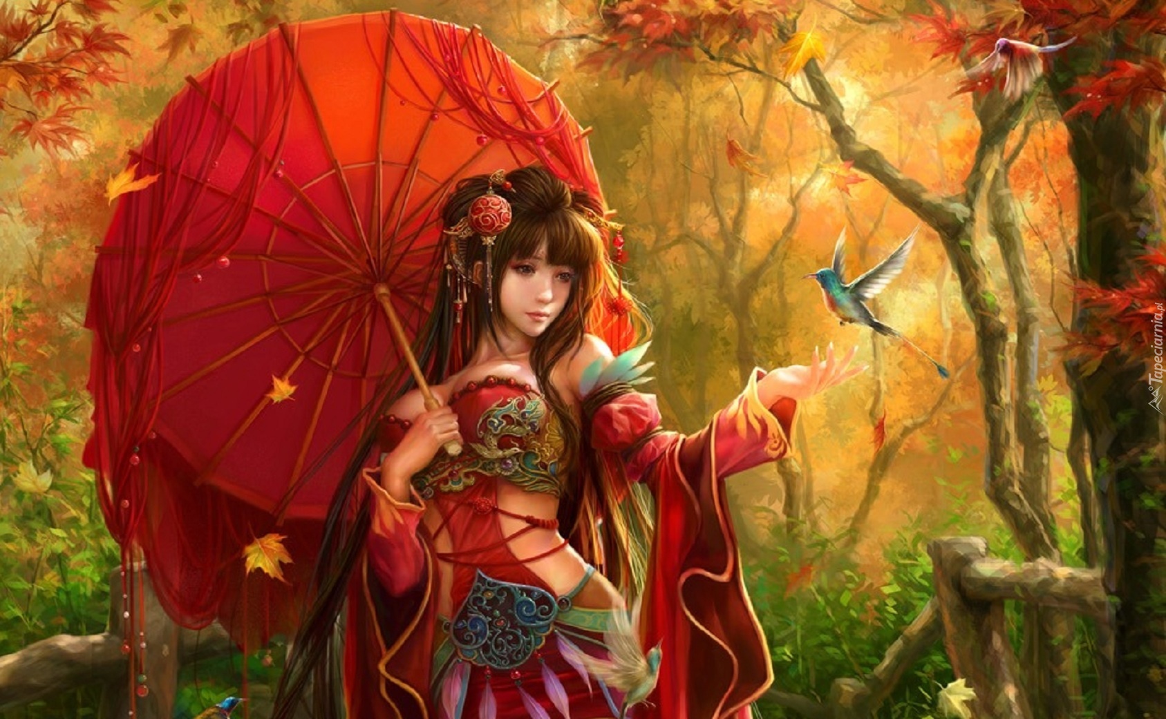 Edytor tapety: Dziewczyna, Parasol, Las, Ptak, Manga Anime