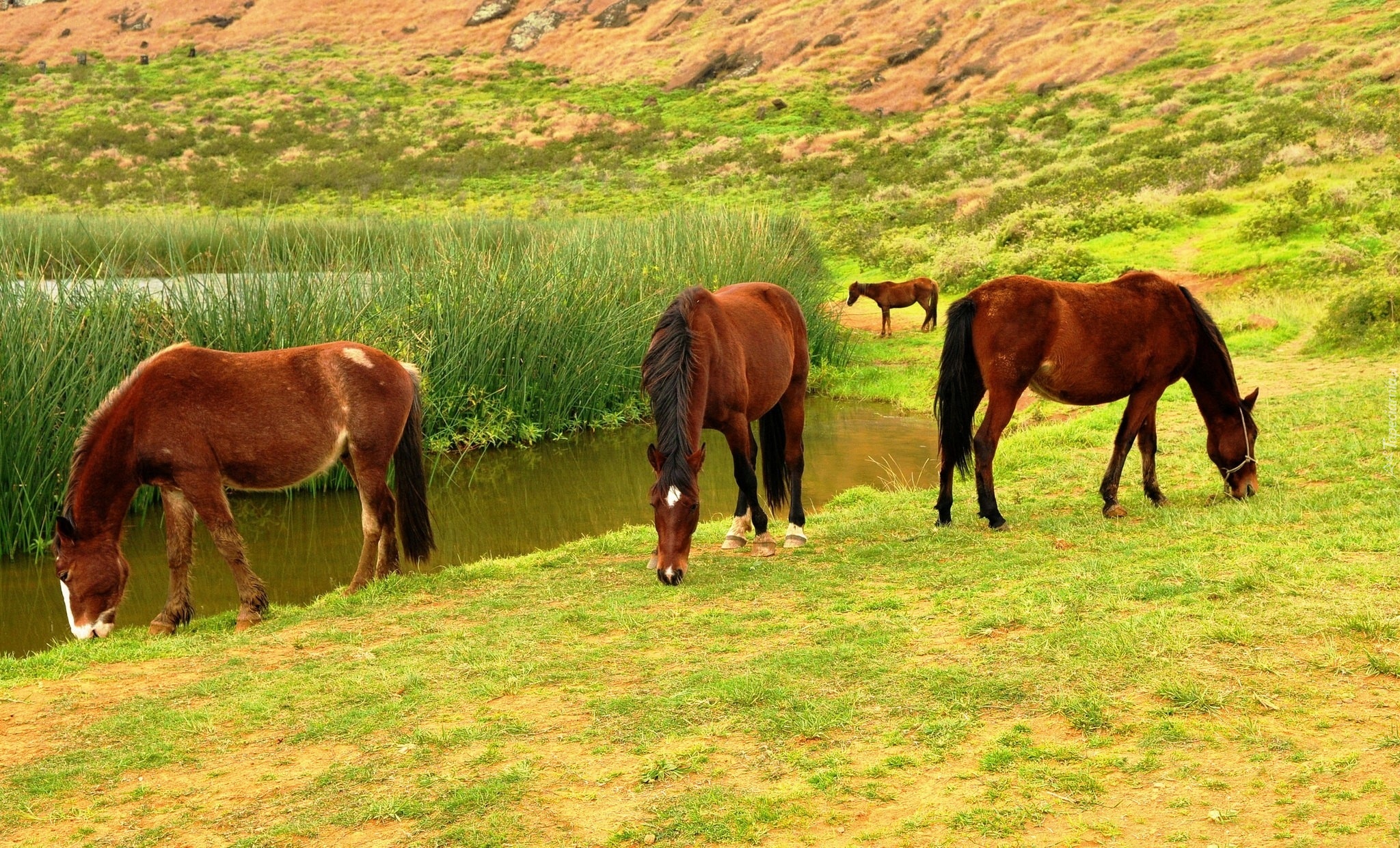 Edytor tapety: Konie, Jezioro, Trawa