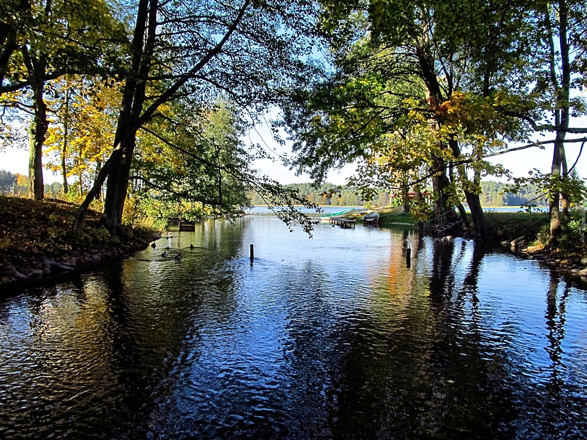 Edytor tapety: Rzeka, Drzewa, Łódki, Jesień