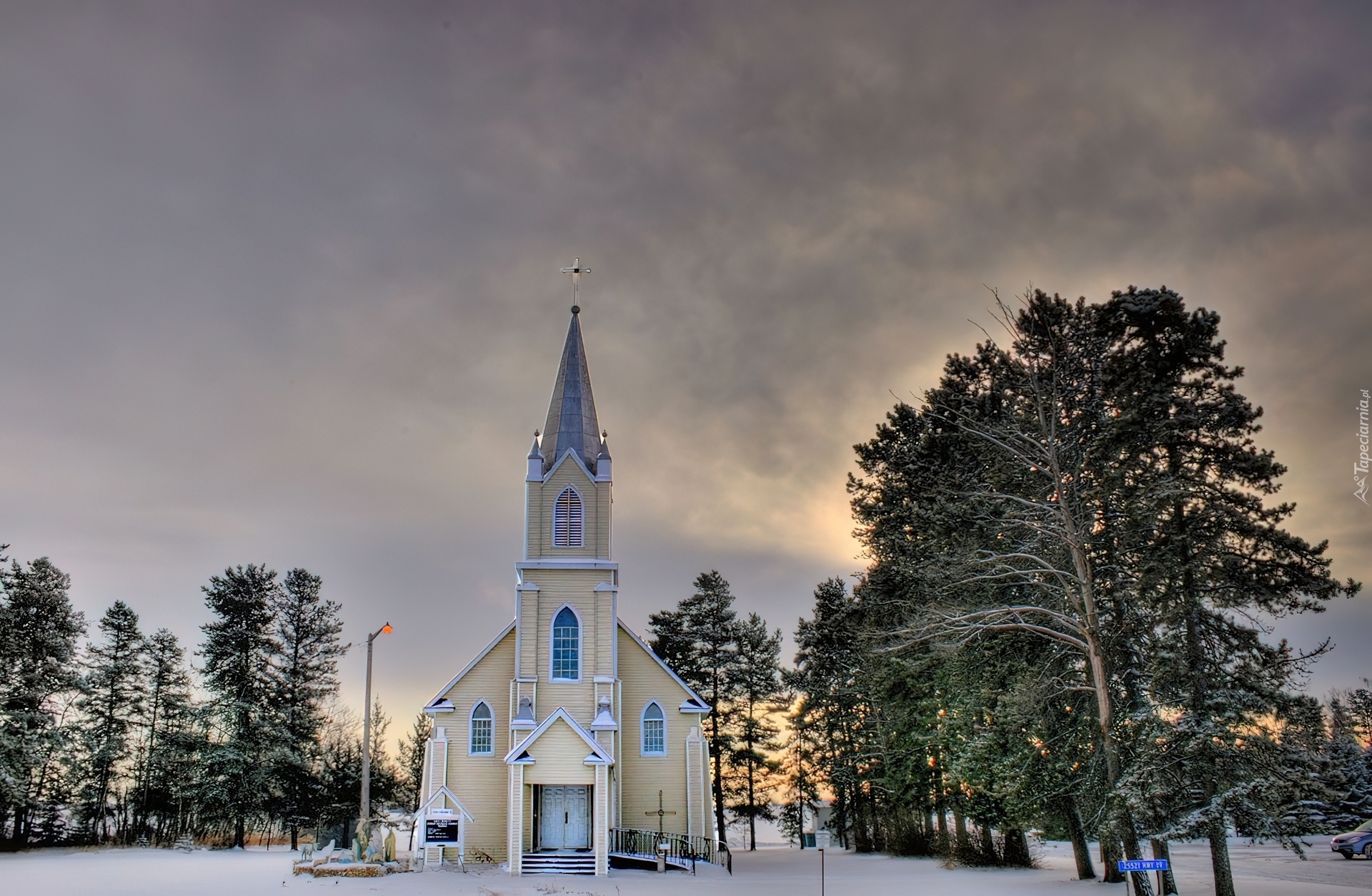 Edytor tapety: Zima, Kościółek, Drzewa, Alberta, Kanada