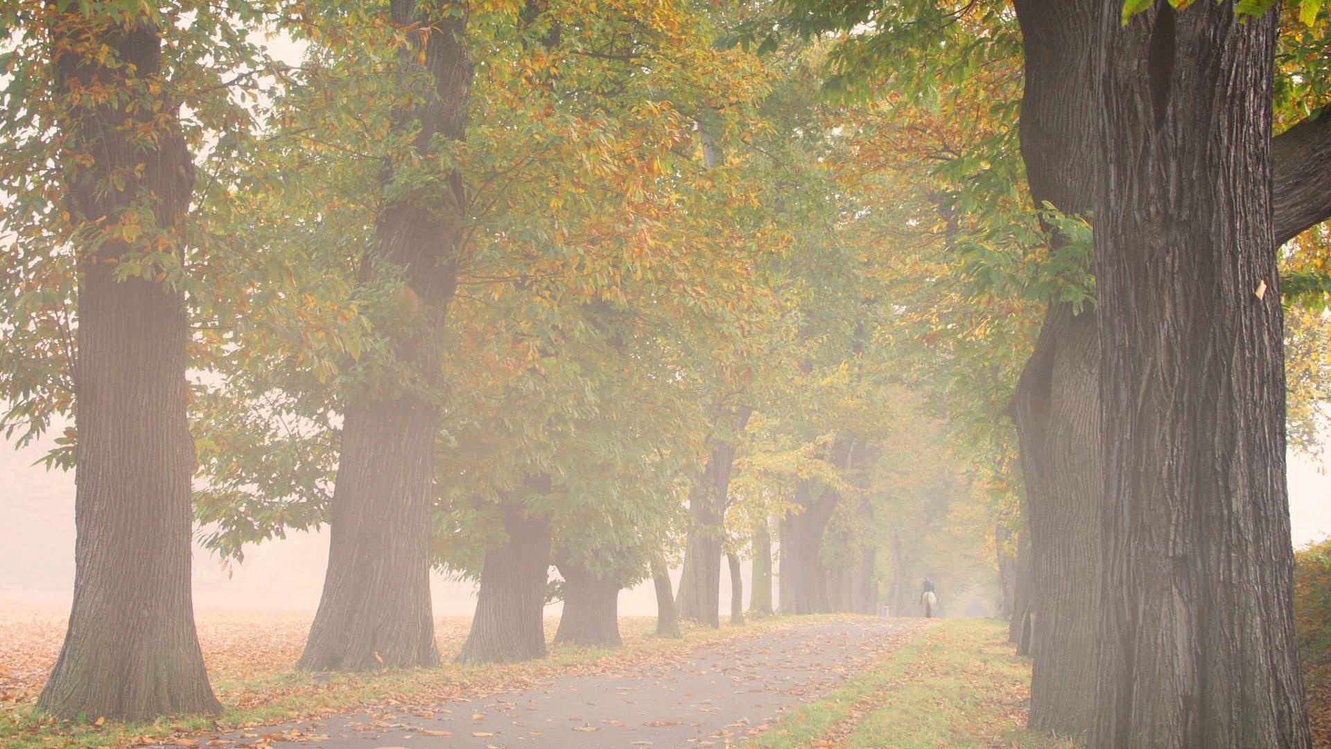 Edytor tapety: Droga, Drzewa, Mgła, Koń