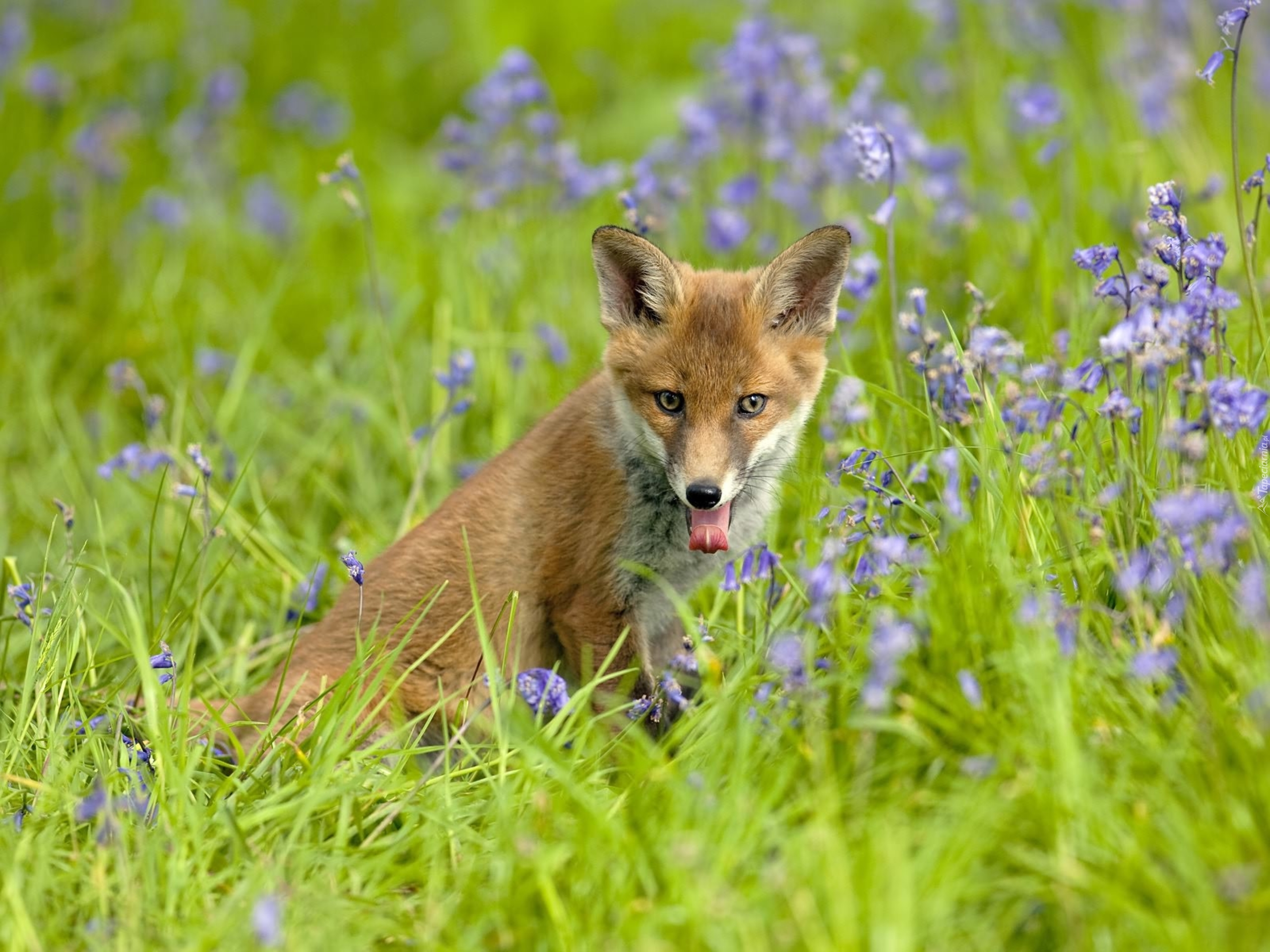 Edytor tapety: Młody, Lisek, Język, Trawa, Polne, Kwiatki