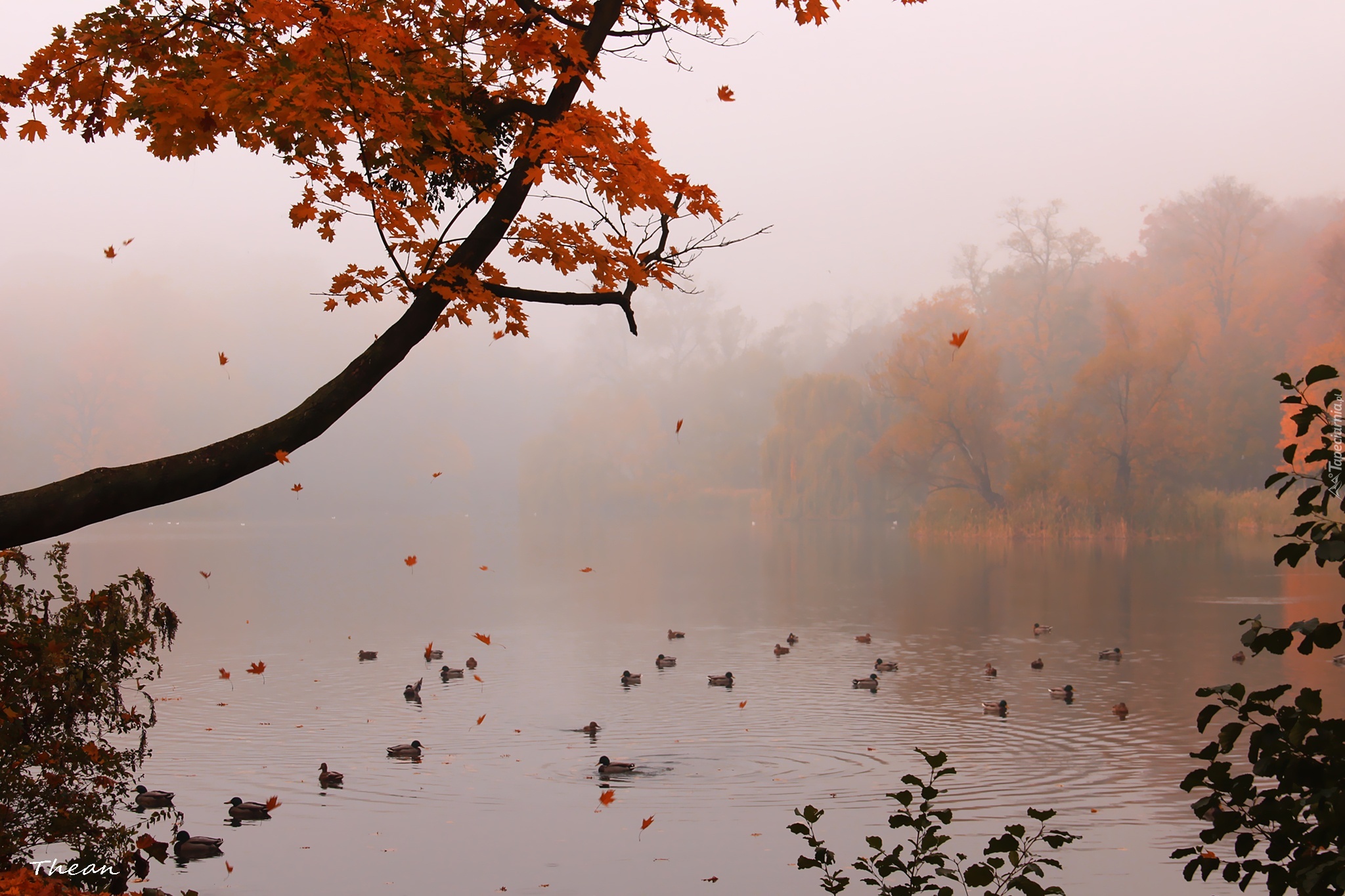 Edytor tapety: Mgła, Jezioro, Kaczki, Drzewo, Spadające, Liście