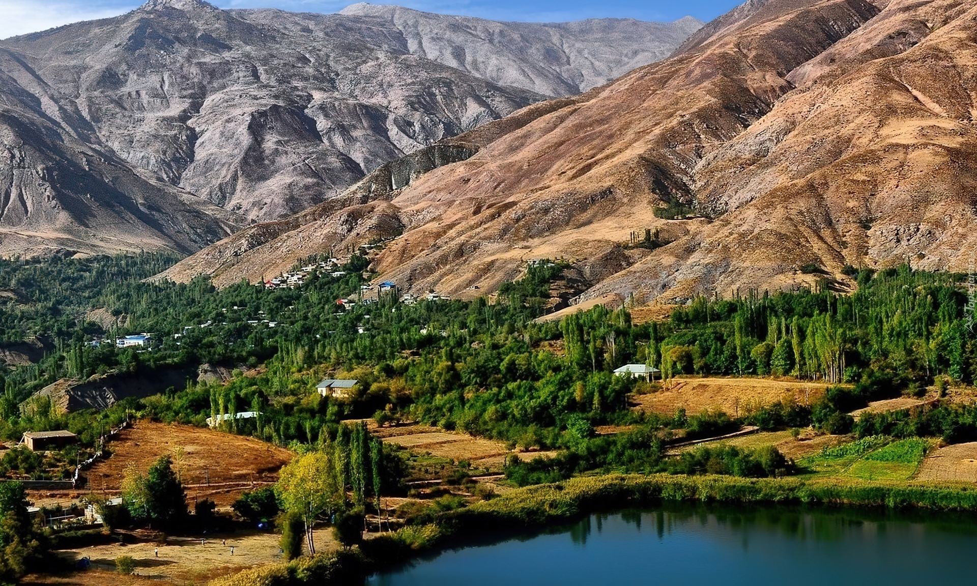 Edytor tapety: Góry, Dolina, Pola, Woda