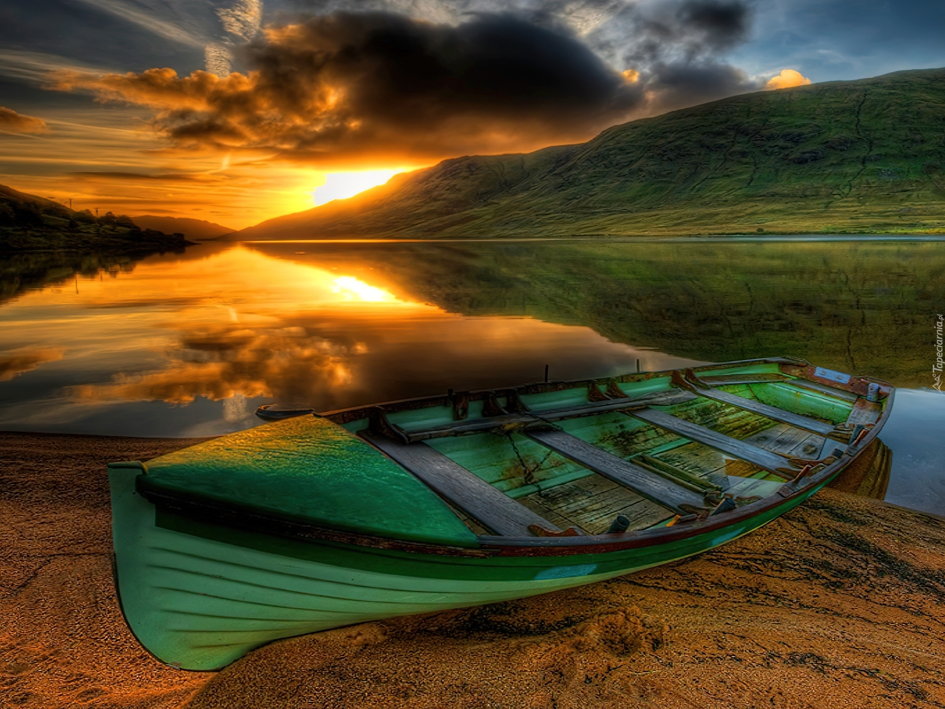 Edytor tapety: Zachód, Słońca, Rzeka, Łajba