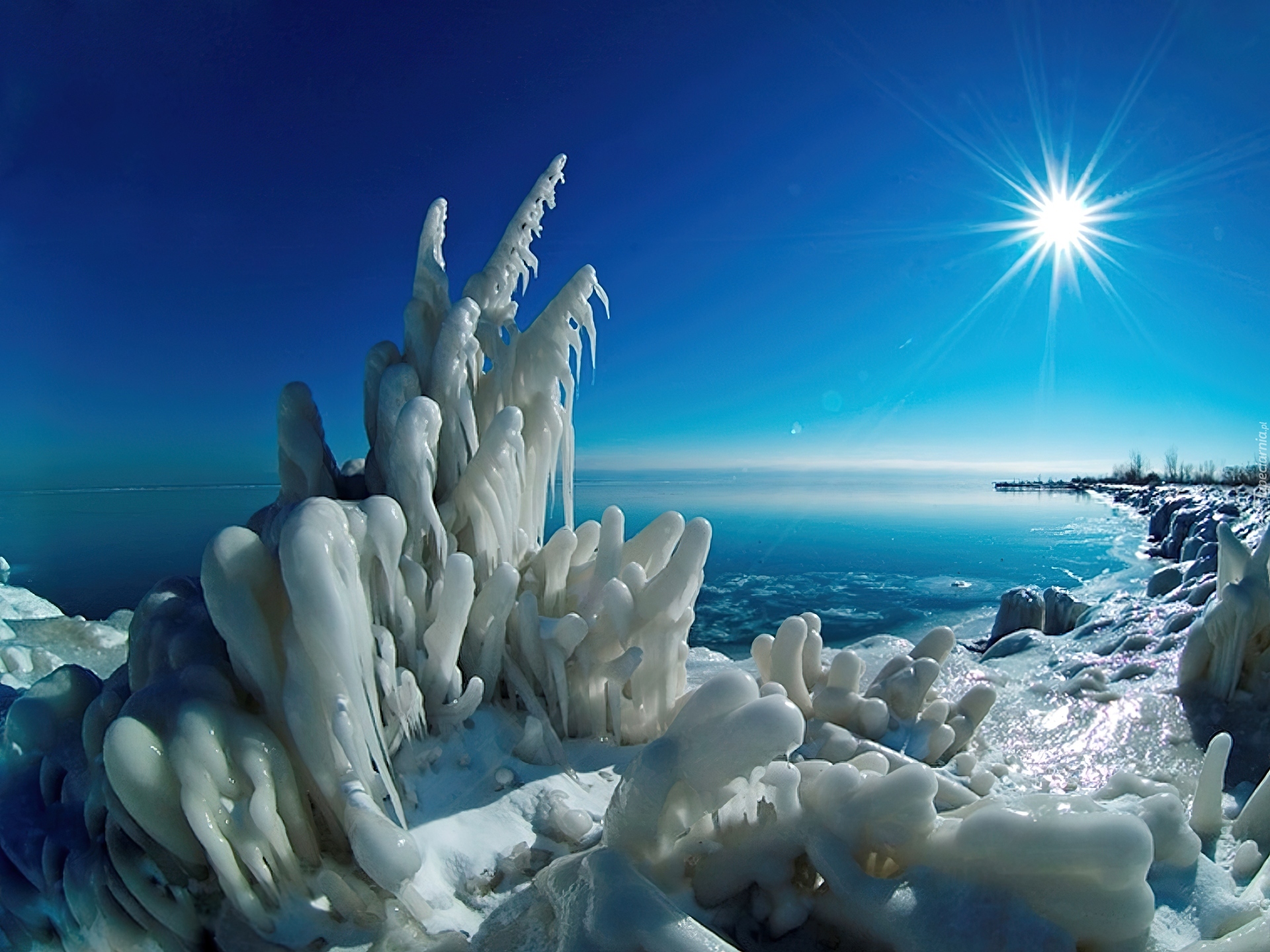 Edytor tapety: Promienie, Słońca, Morze, Nieboe, Krzewy, Pokryte, Lodem