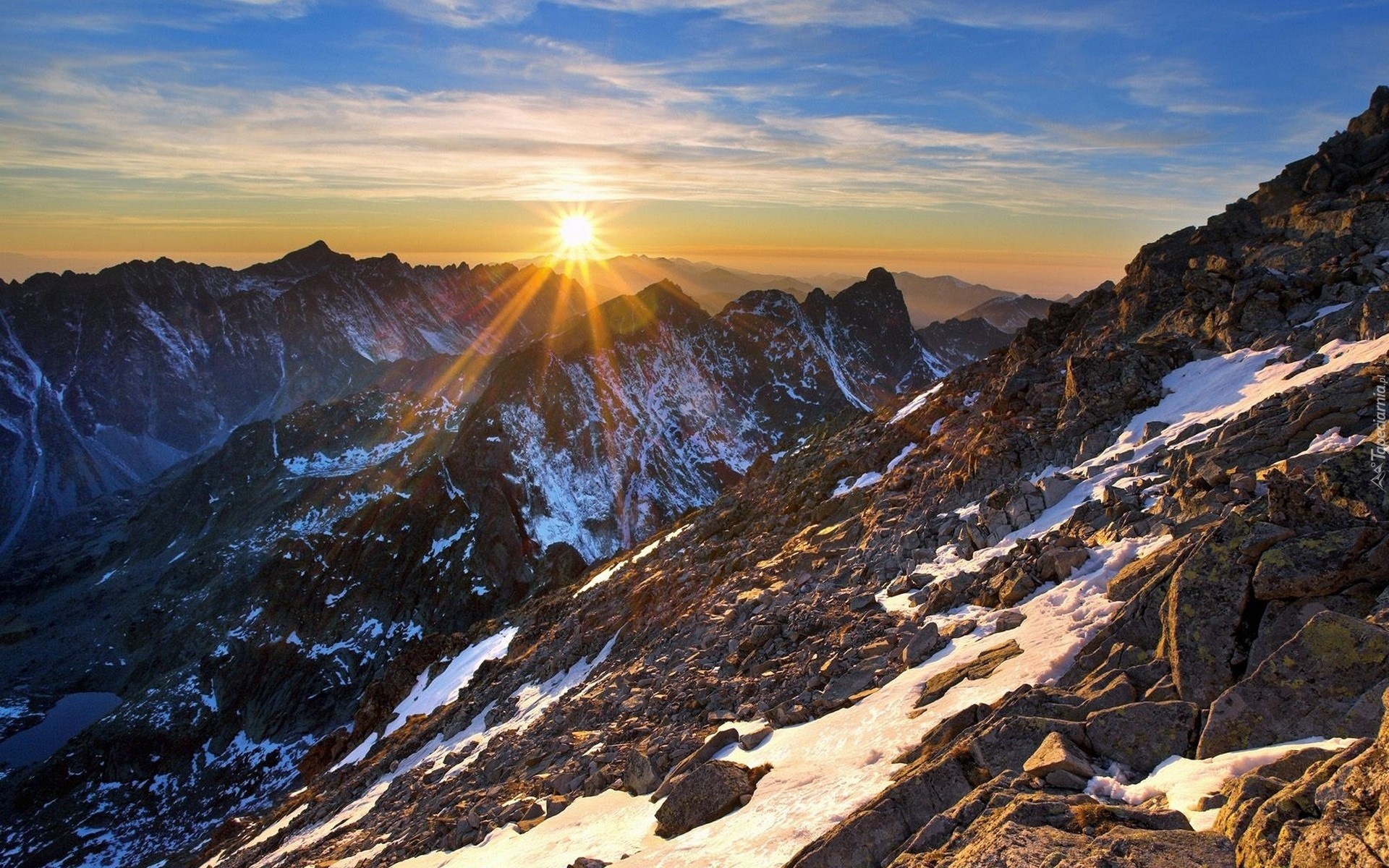 Edytor tapety: Ośnieżone, Góry, Promienie, Słońca, Niebo