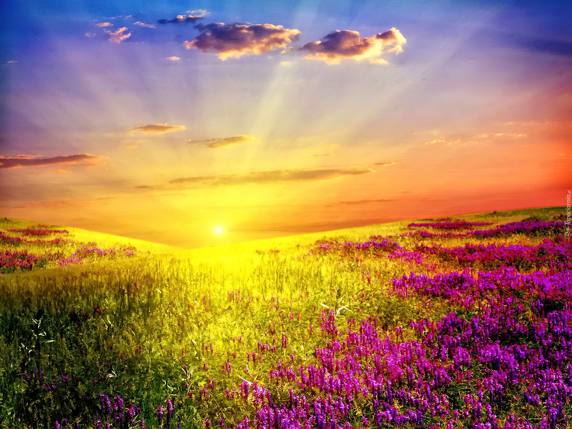 Edytor tapety: Promienie, Słońca, Łąka, Kwiaty