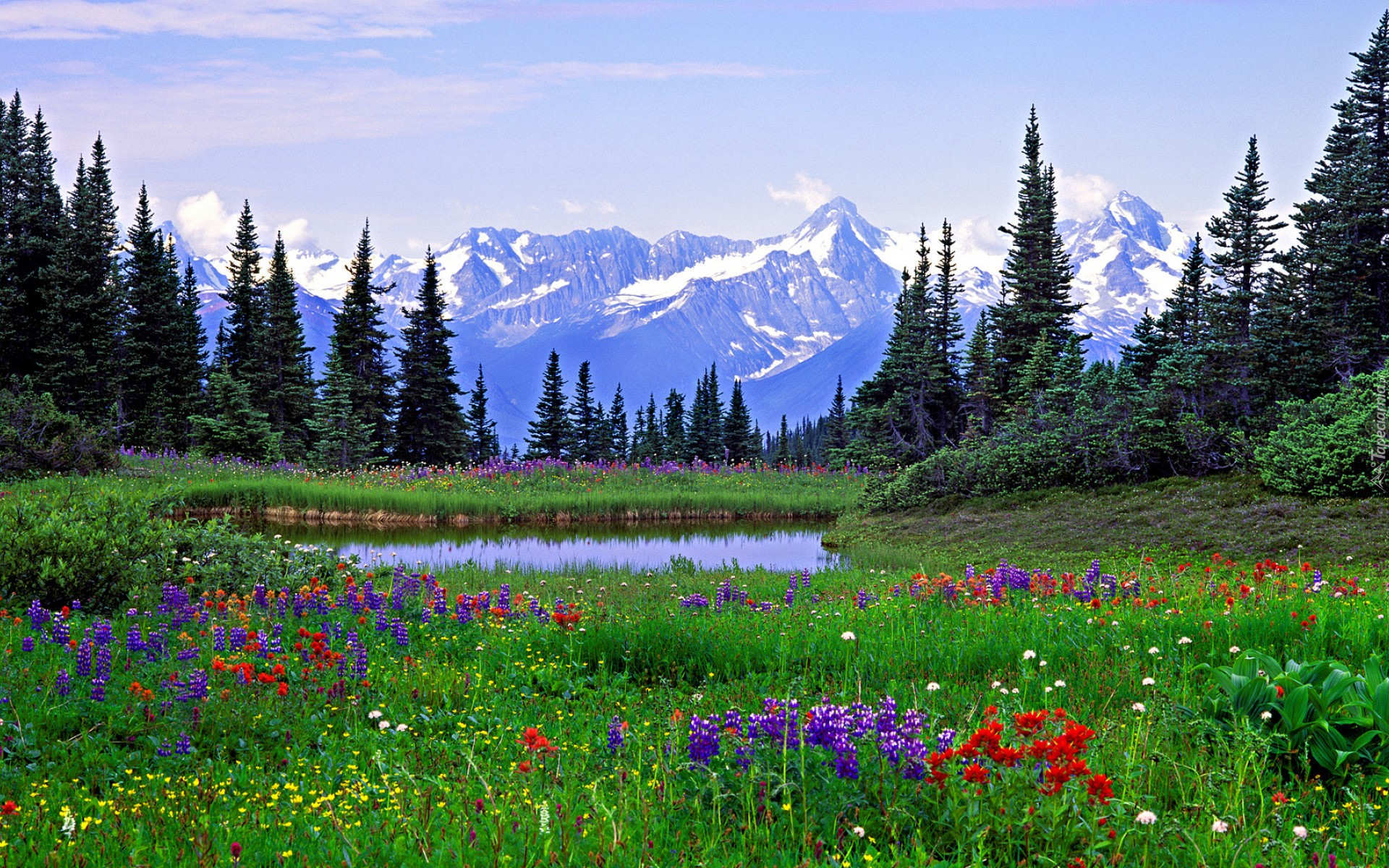 Edytor tapety: Łąka, Kwiaty, Ośnieżone, Góry