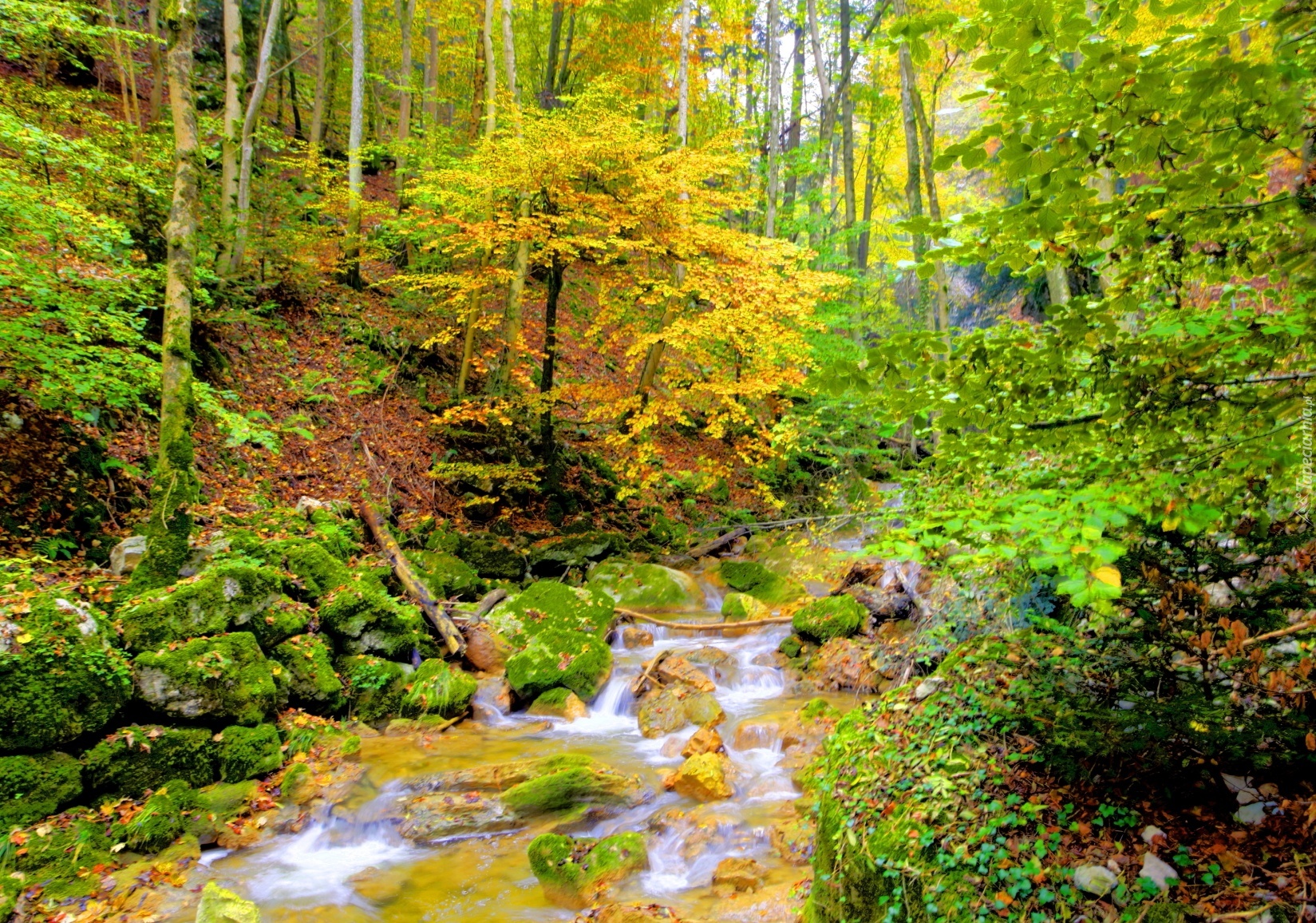Edytor tapety: Las, Strumyk, Drzewa, Jesień