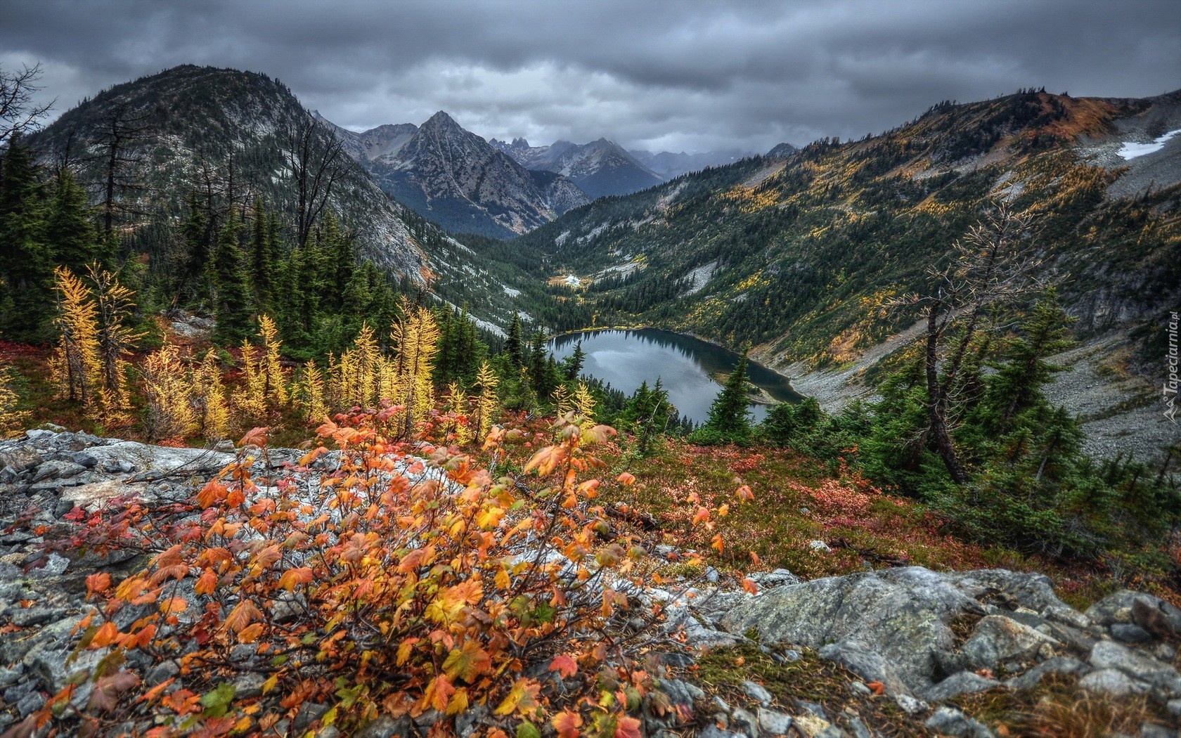 Edytor tapety: Jesień, Góry, Jezioro, Drzewa, Zachmurzone, Niebo