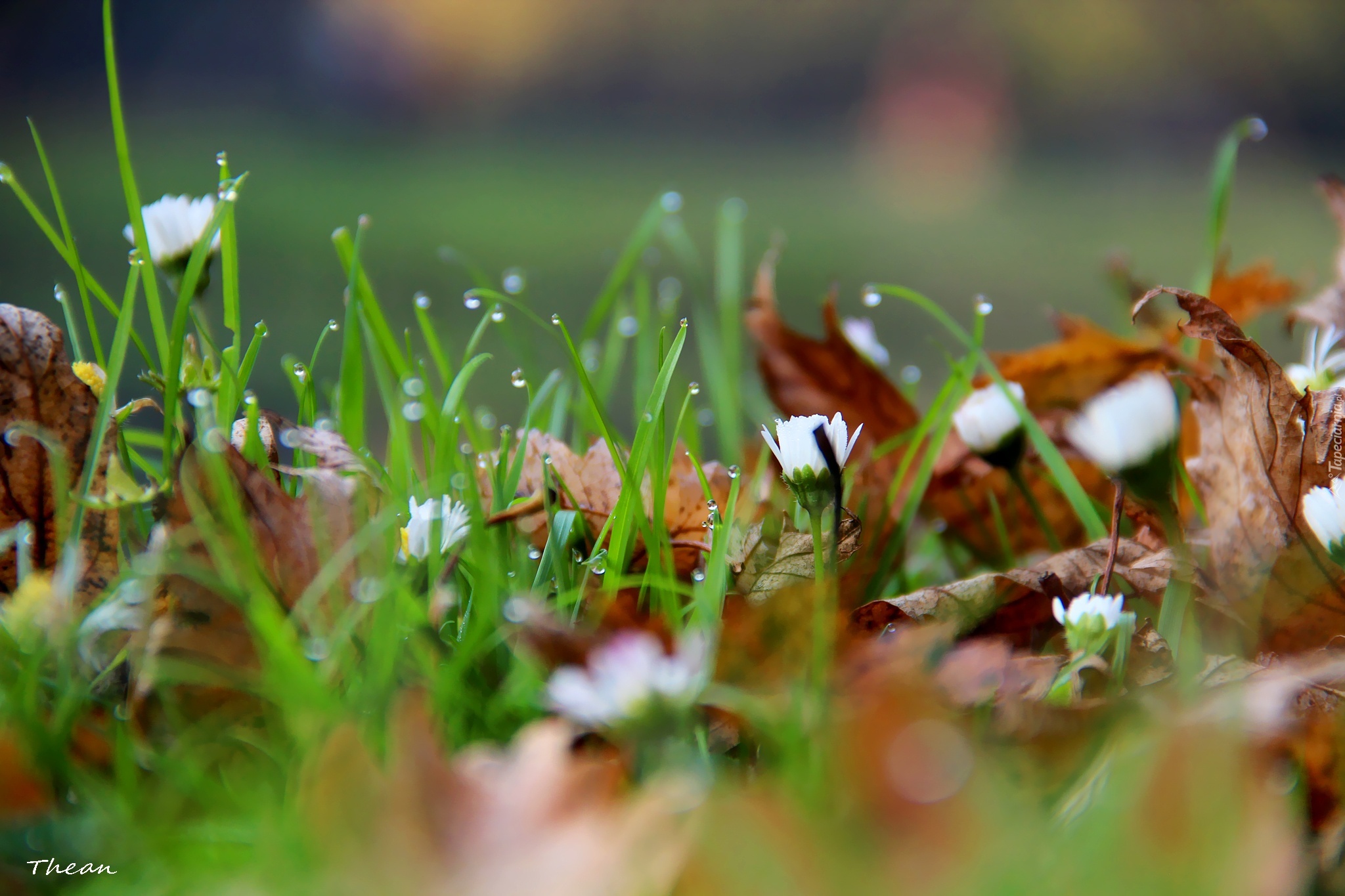 Edytor tapety: Trawa, Stokrotki, Suche, Liście, Kropelki