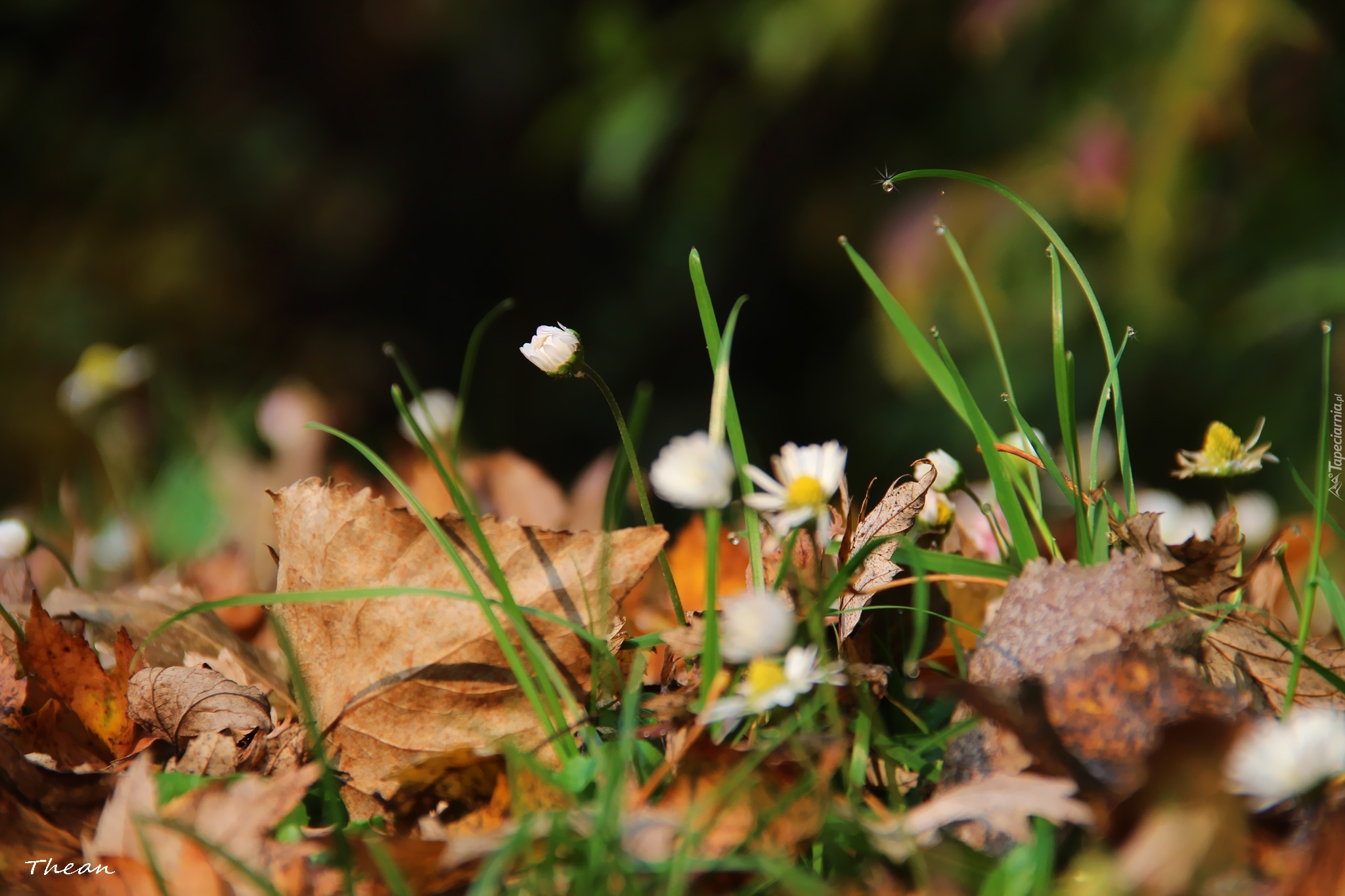Edytor tapety: Stokrotki, Trawa, Suche, Liście, Kropelki