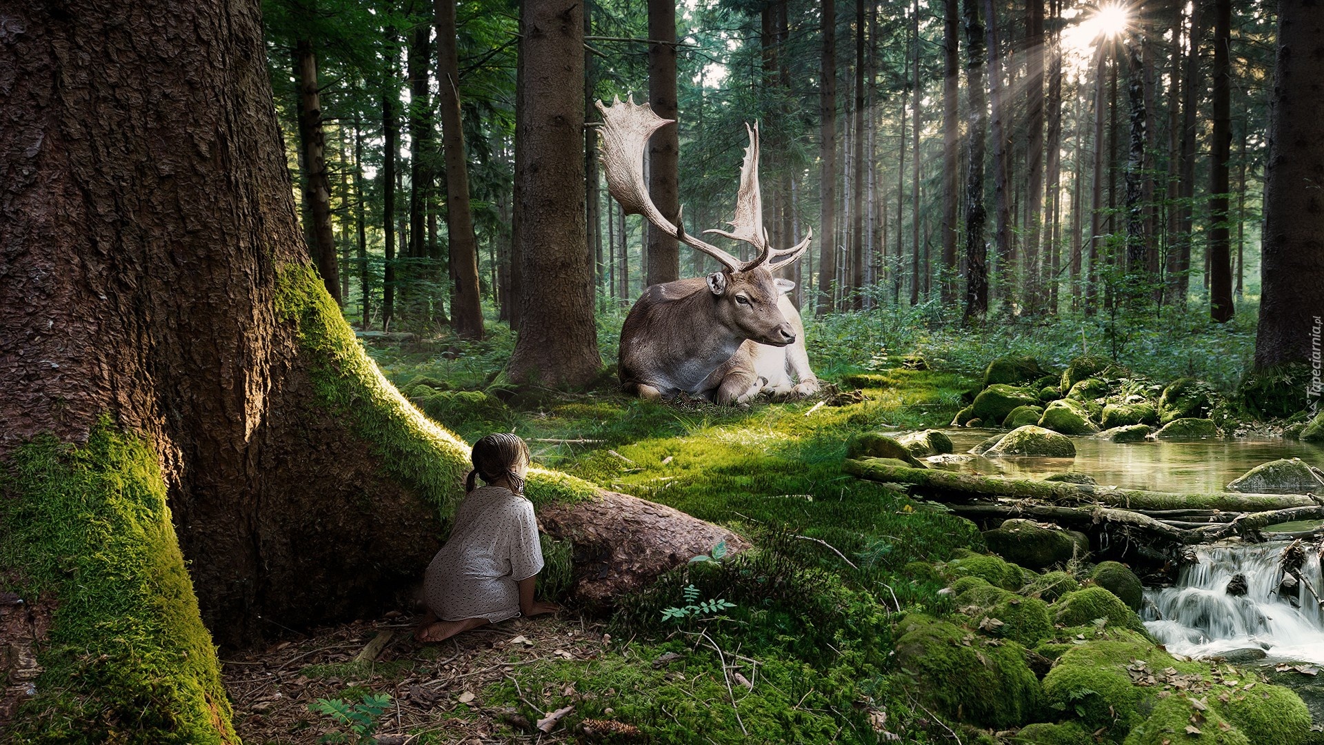 Edytor tapety: Jeleń, Las, Dziewczynka, Grafika