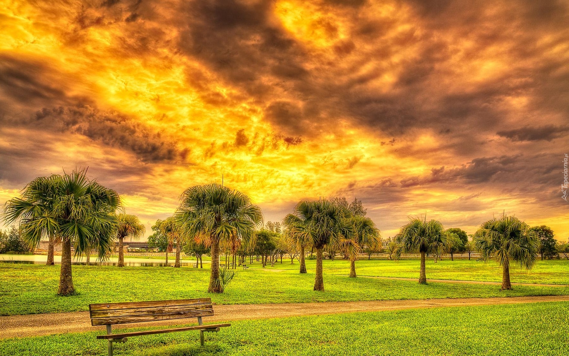Edytor tapety: Zachód, Słońca, Palmy, Park, Ławka
