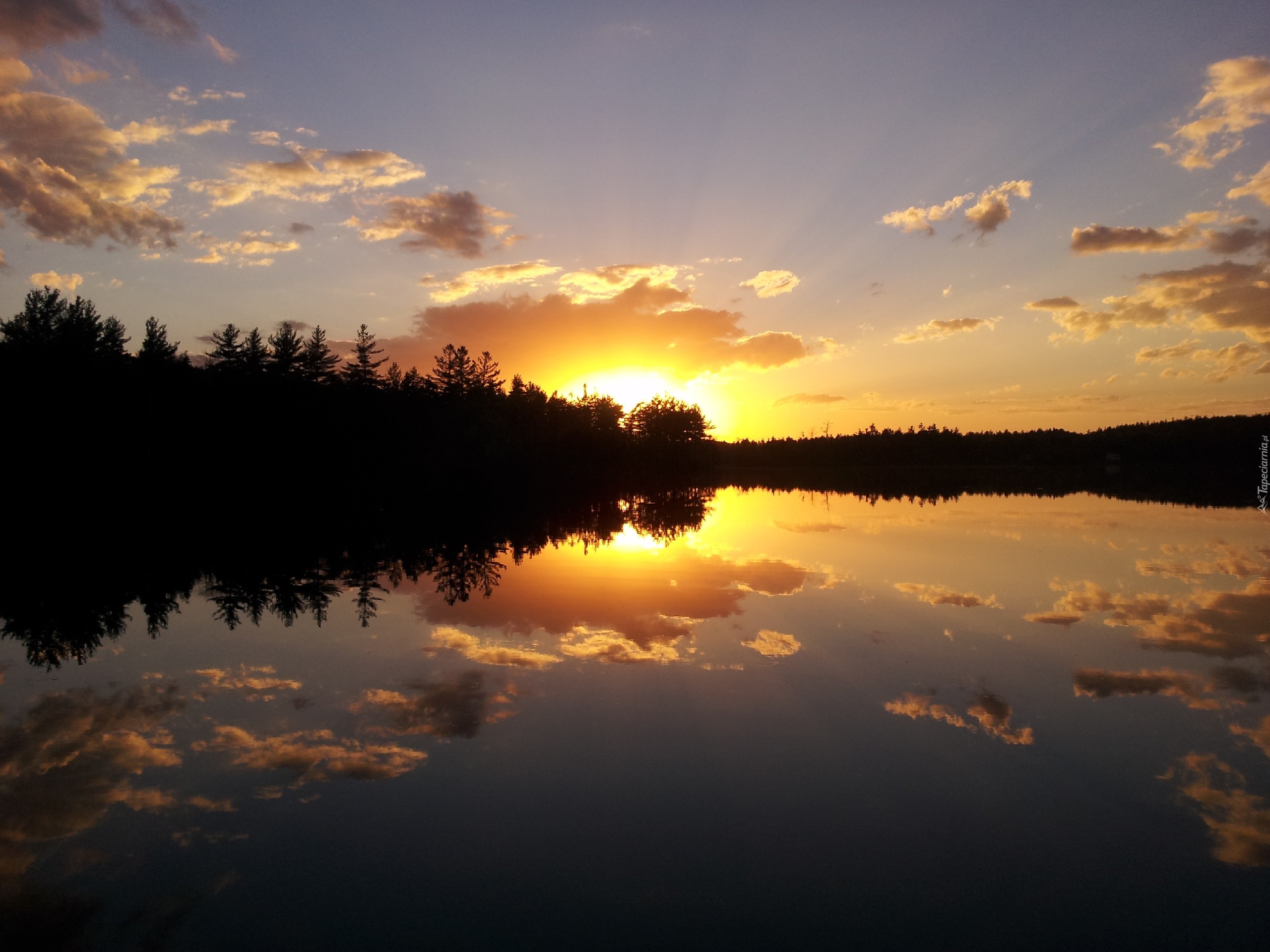 Edytor tapety: Zachód, Słońca, Jezioro, Drzewa, Chmury, Odbicie