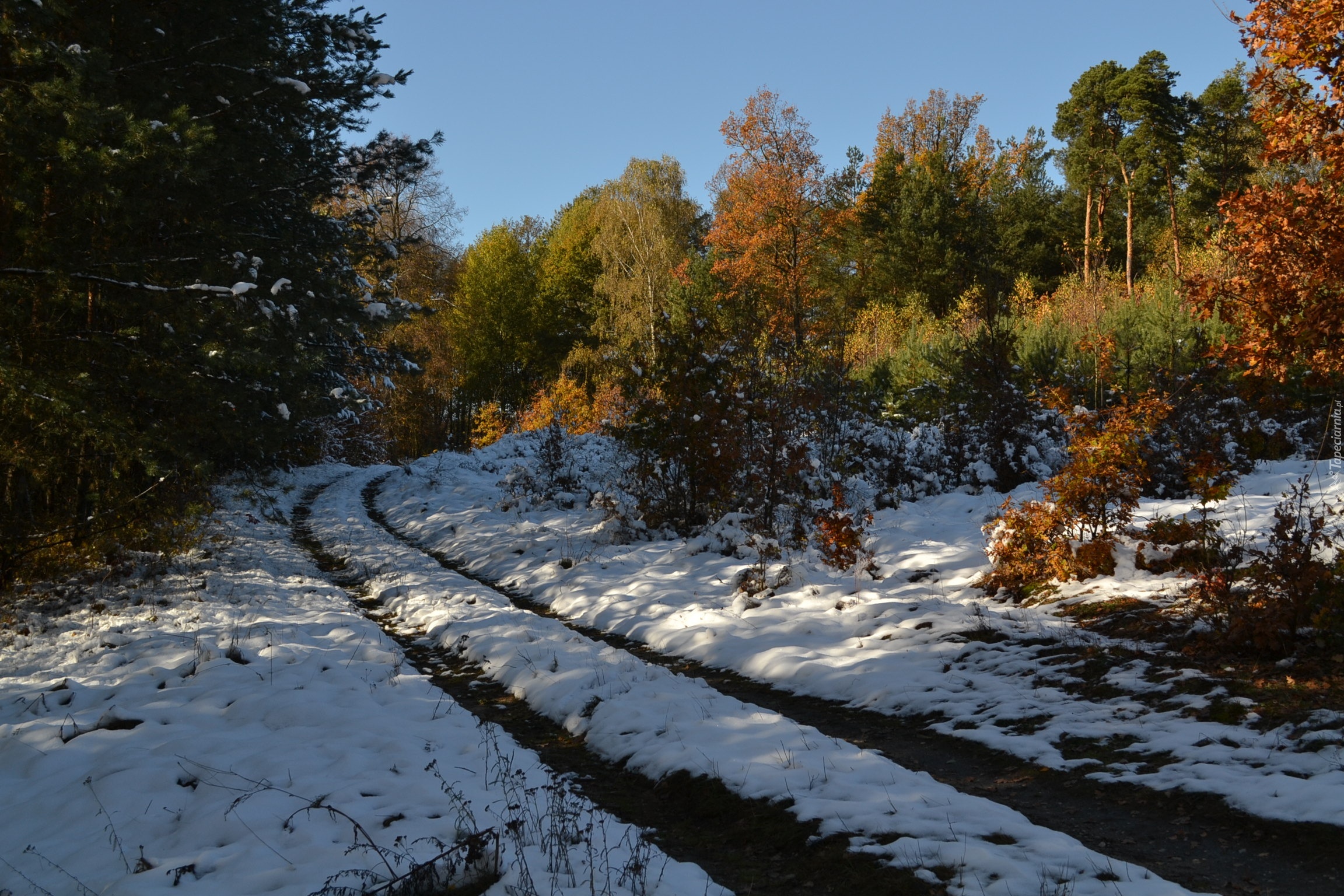 Edytor tapety: Droga, W, Lesie, Jesienne, Kolory, Drzew, Pierwszy, Śnieg