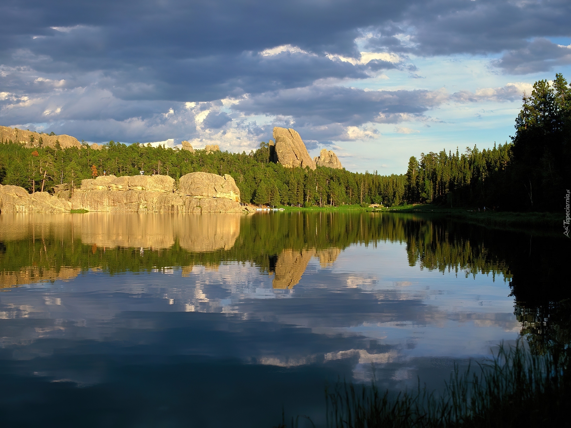 Edytor tapety: Chmury, Jezioro, Las, Skałki