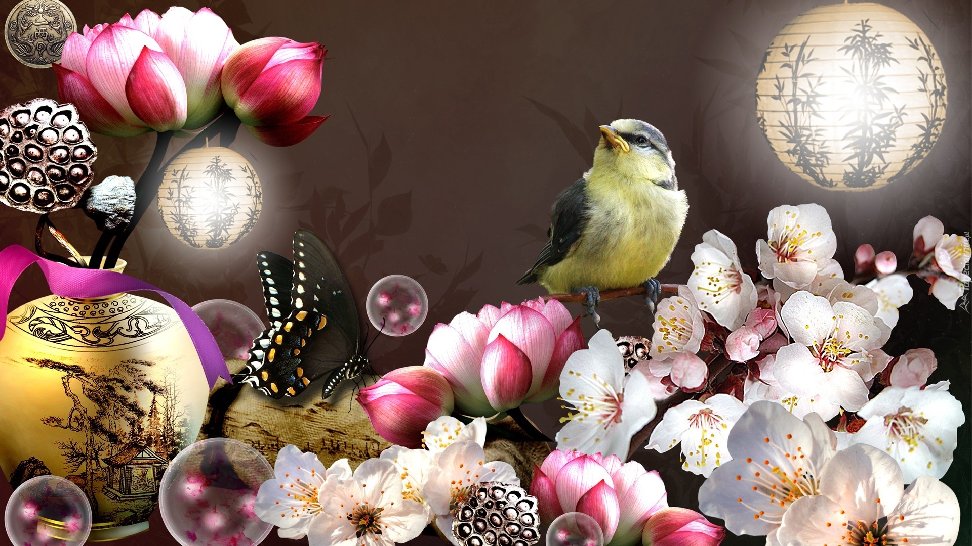 Edytor tapety: Ptaszek, Motyl, Kwiaty, Art