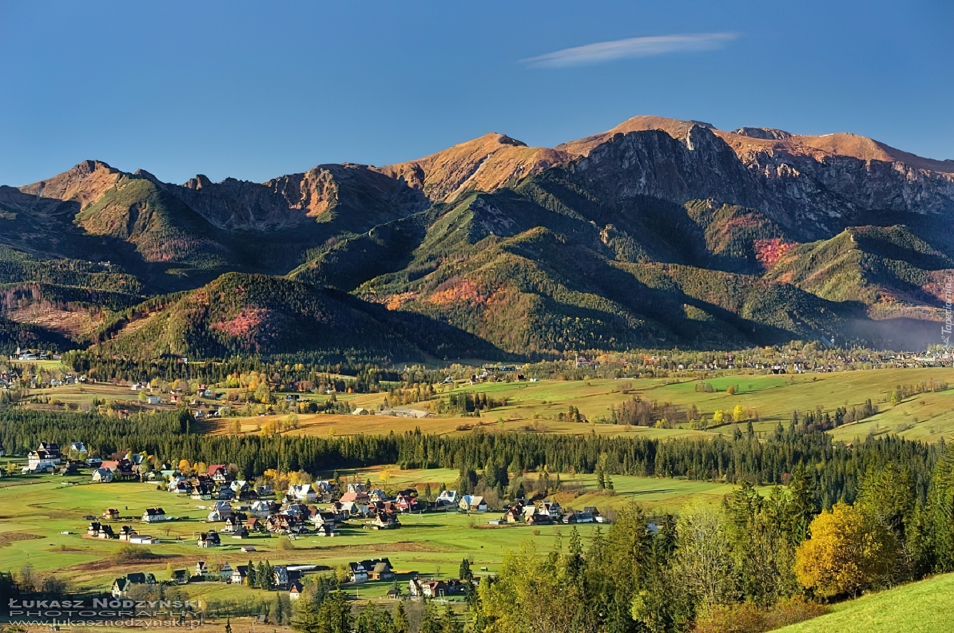Edytor tapety: Góry, Wioska, Domy, Drzewa