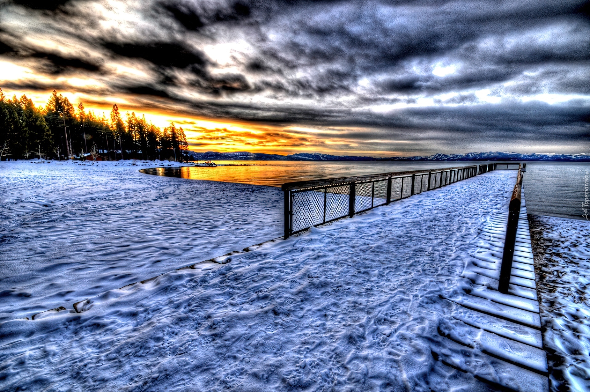 Edytor tapety: Zachód, Słońca, Jezioro, Molo, Śnieg