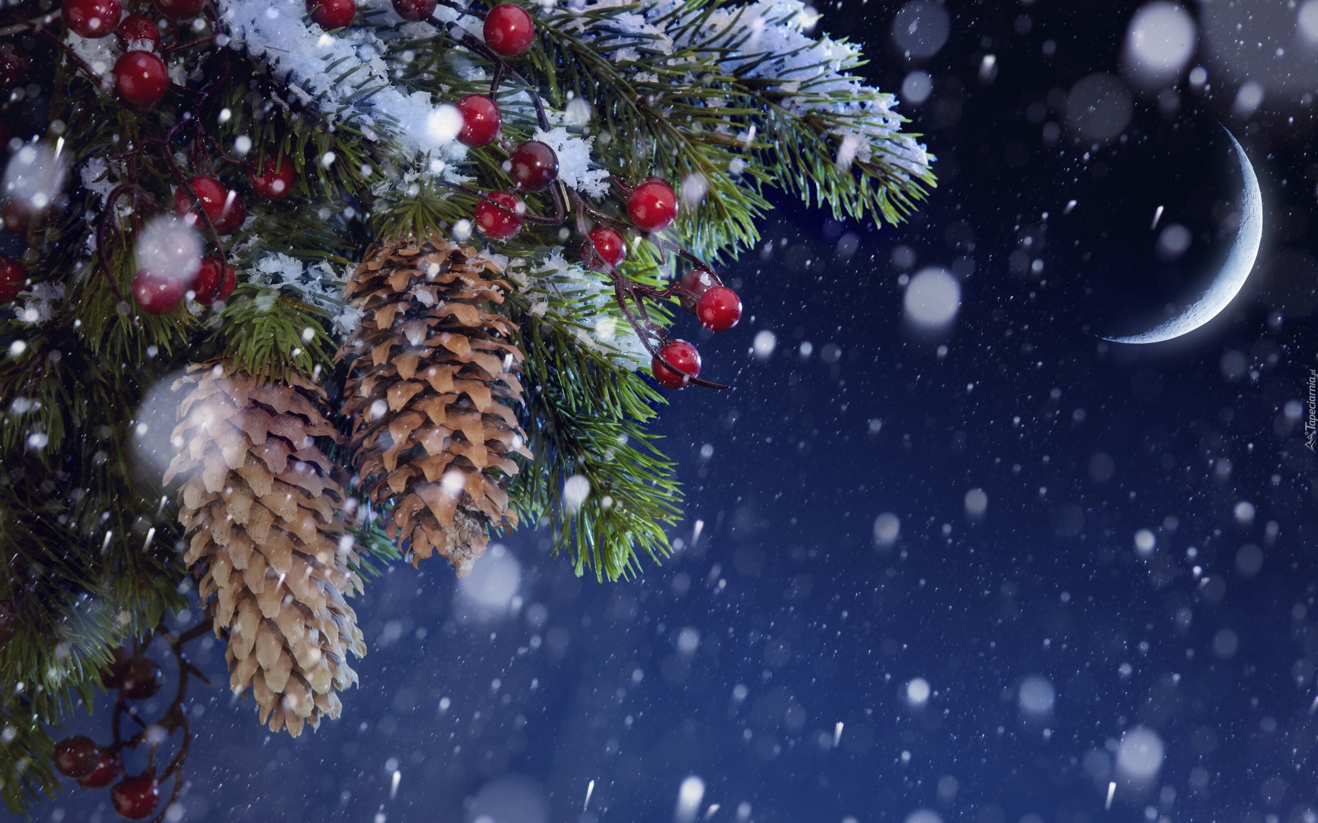 Edytor tapety: Świerk, Szyszki, Księżyc, Śnieg