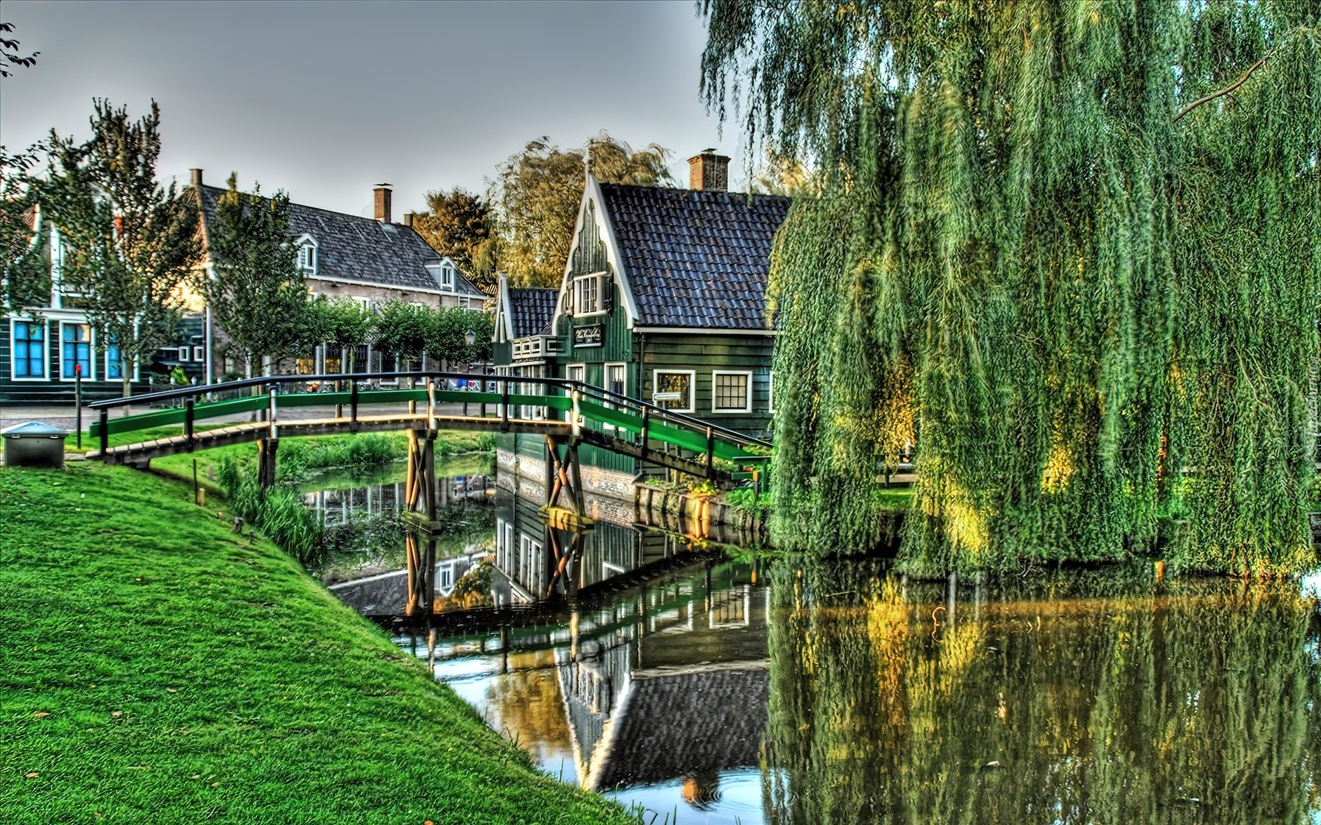 Edytor tapety: Rzeka, Mostek, Domy, Drzewa, Trawa