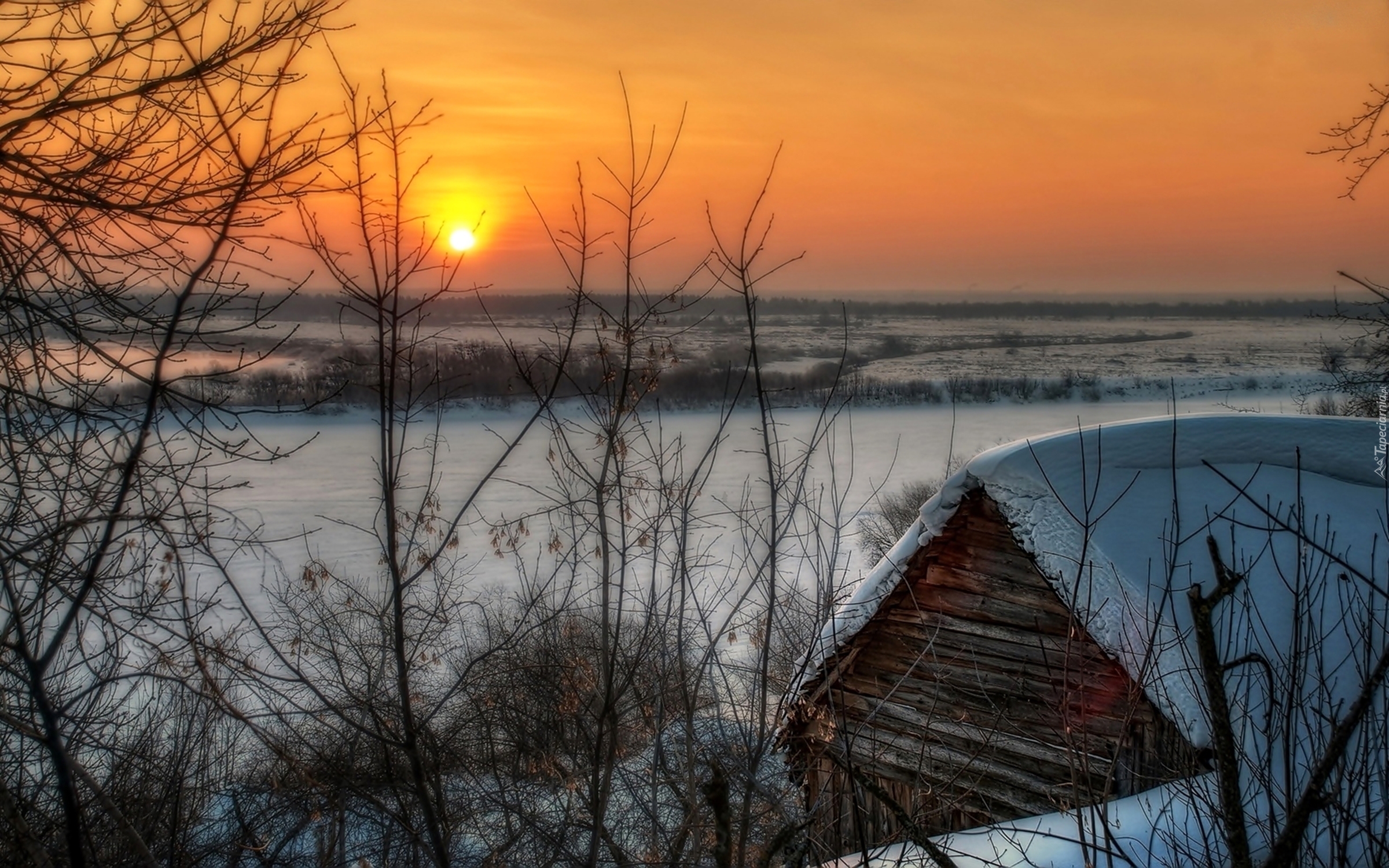Edytor tapety: Pola, Szopa, Drzewa, Zachód, Słońca, Zima