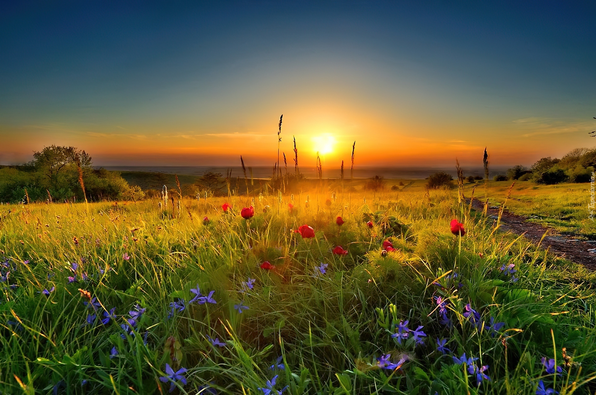 Edytor tapety: Zachód Słońca, Łąka, Maki, Niebo