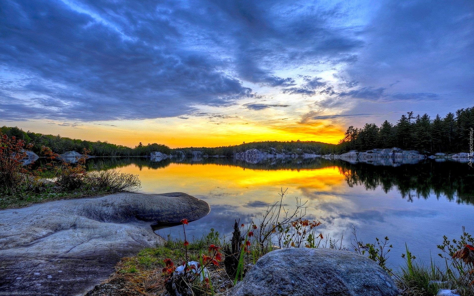 Edytor tapety: Jezioro, Zachód Słońca, Kamienie