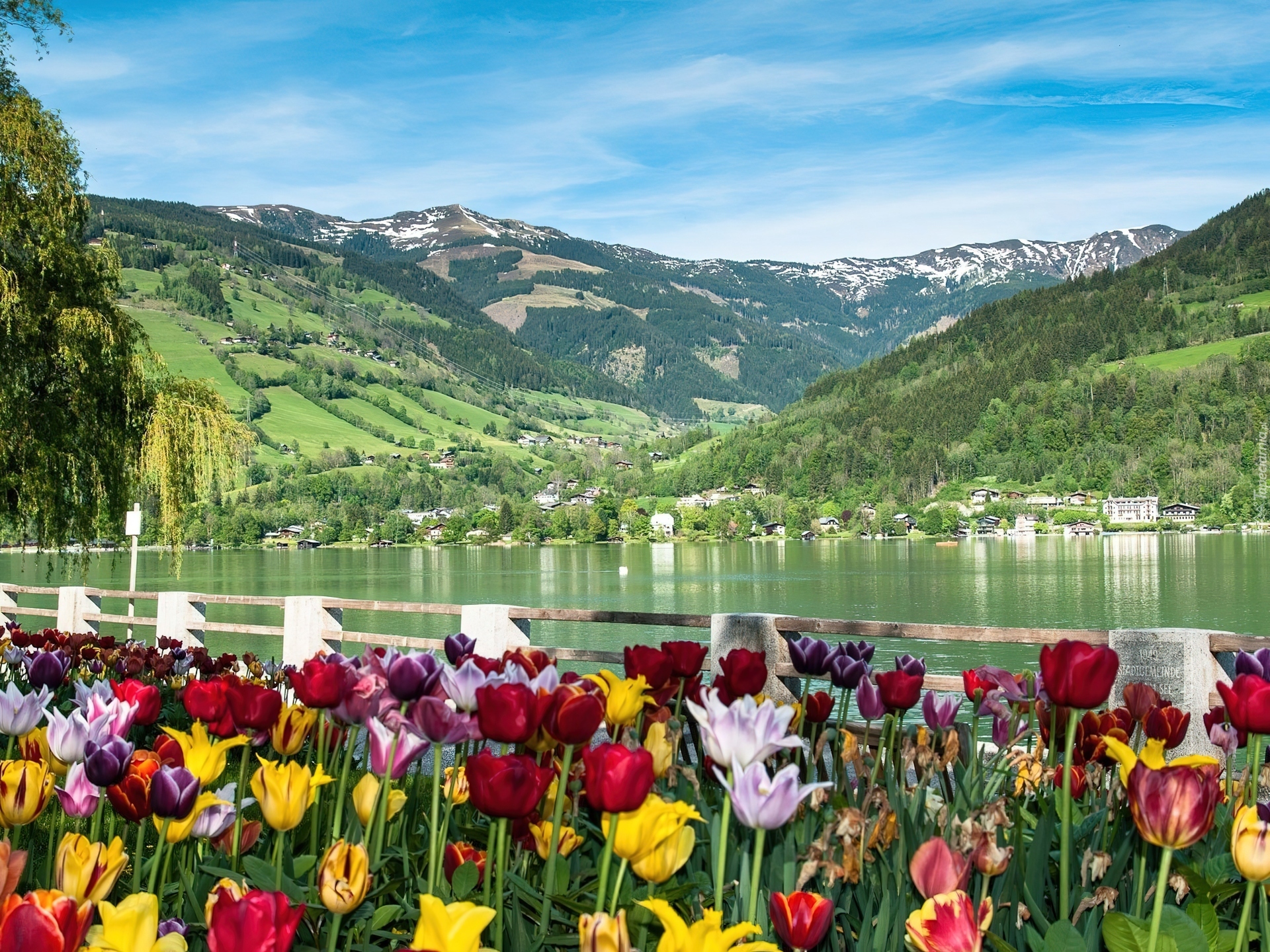 Edytor tapety: Tulipany, Jezioro, Góry