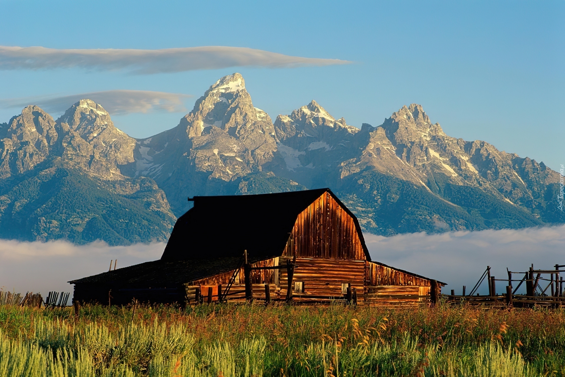 Edytor tapety: Drewniany, Budynek, Trawa, Góry