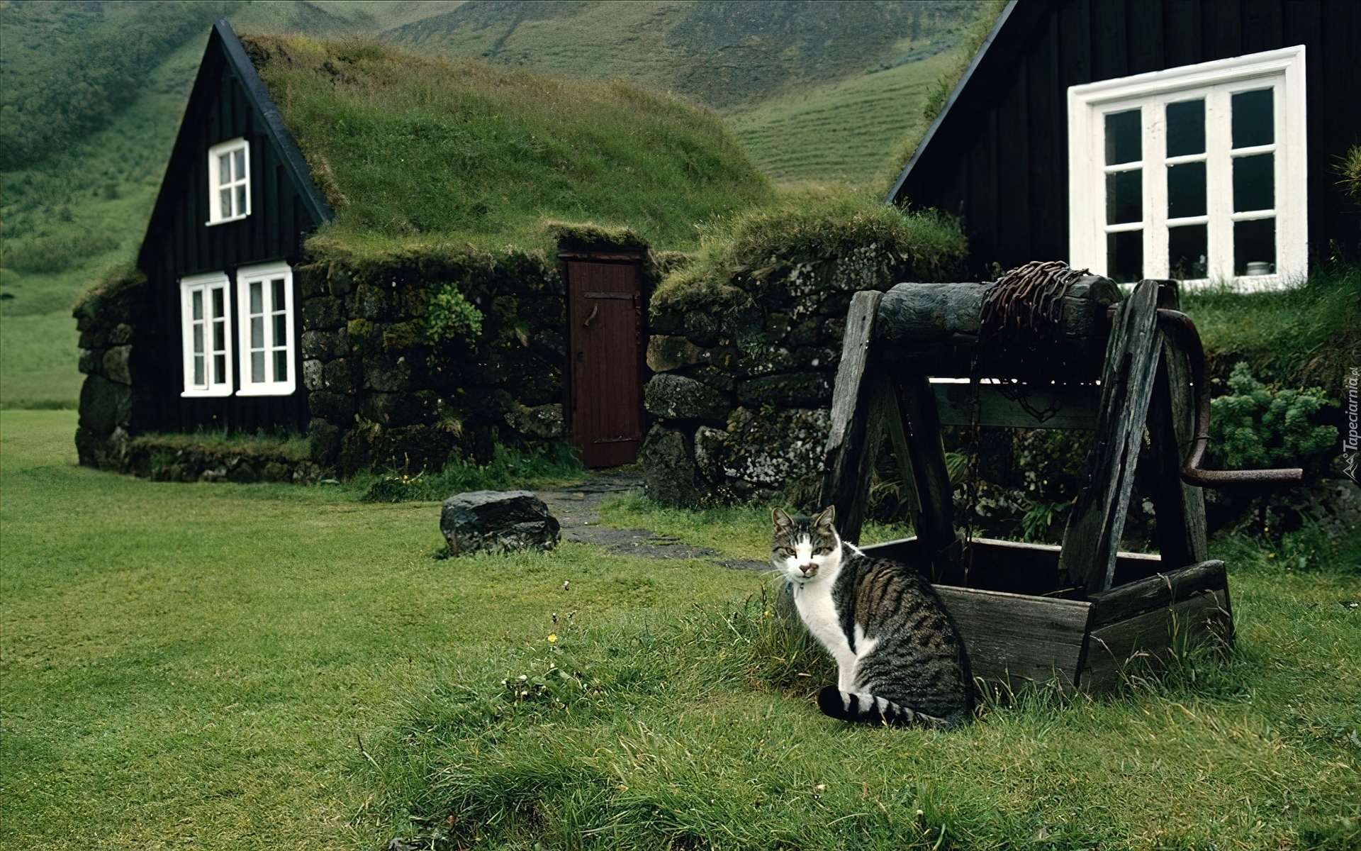 Edytor tapety: Wiejskie, Domy, Studnia, Kot