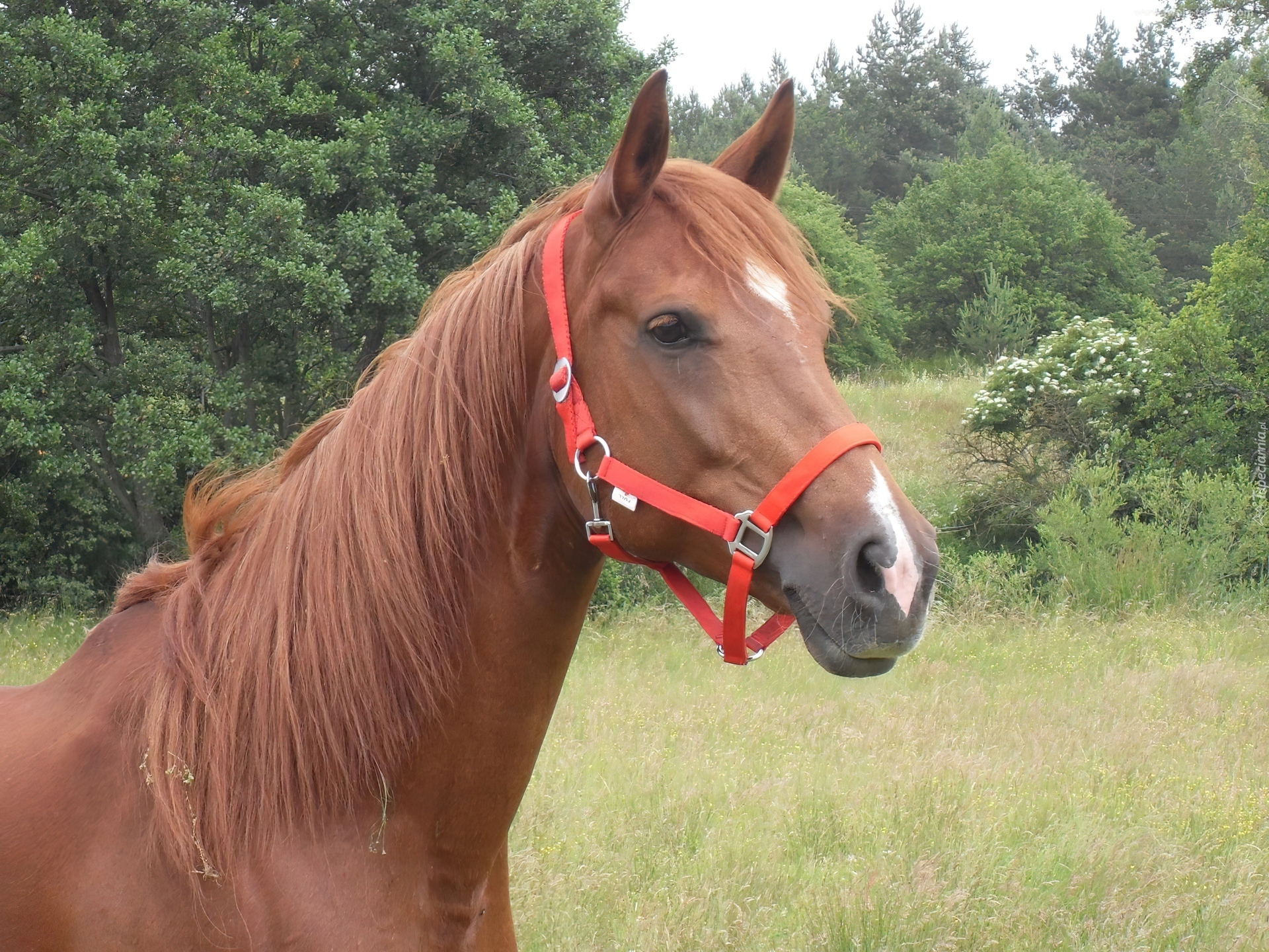 Edytor tapety: Głowa, Konia, Czerwony, Kantar, Łąka