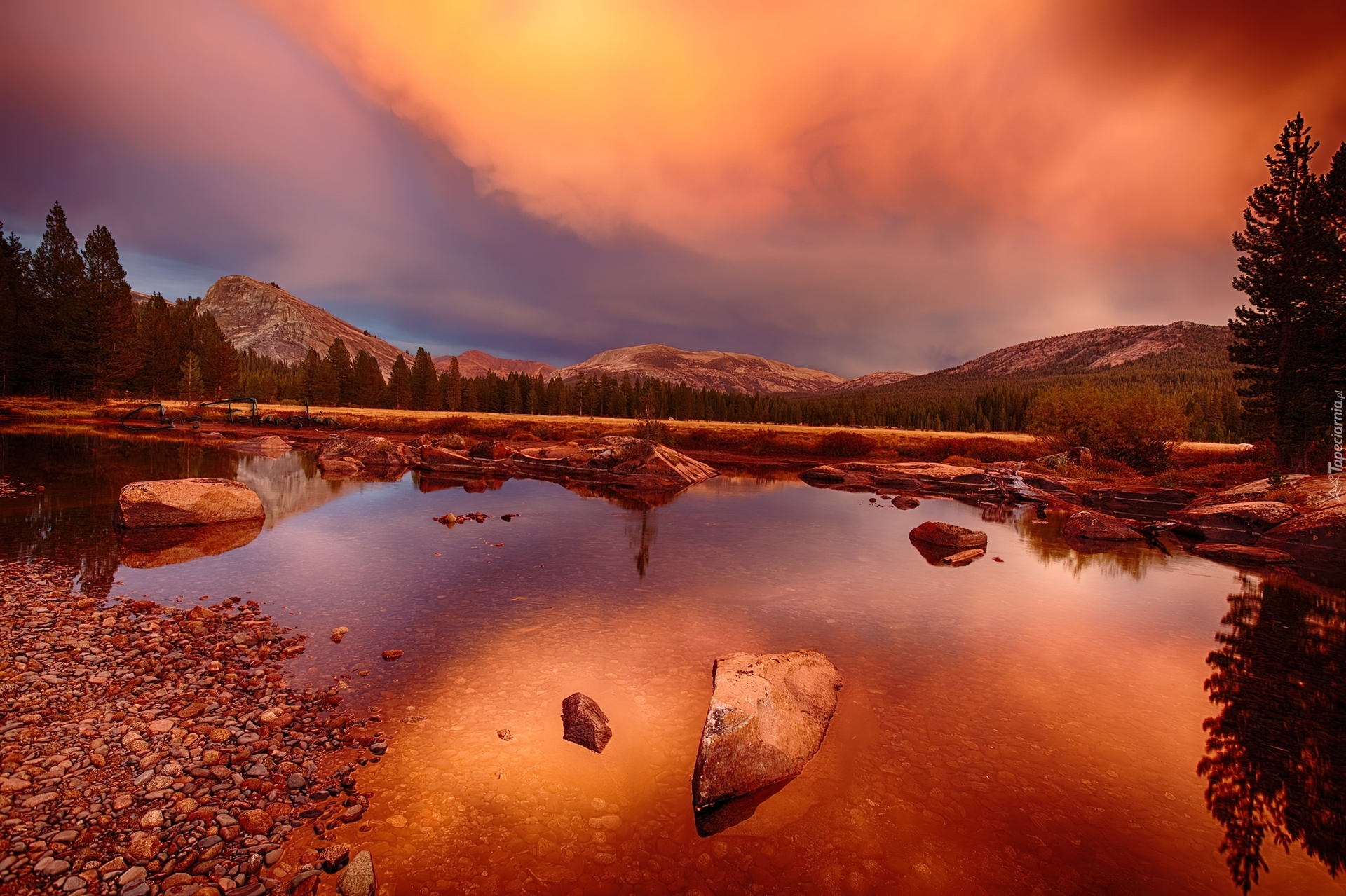 Edytor tapety: Zachód Słońca, Rzeka, Kamienie, Góry