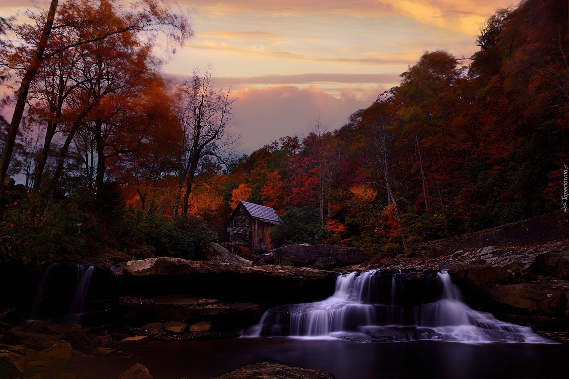 Edytor tapety: Wodospad, Młyn Wodny, Drzewa