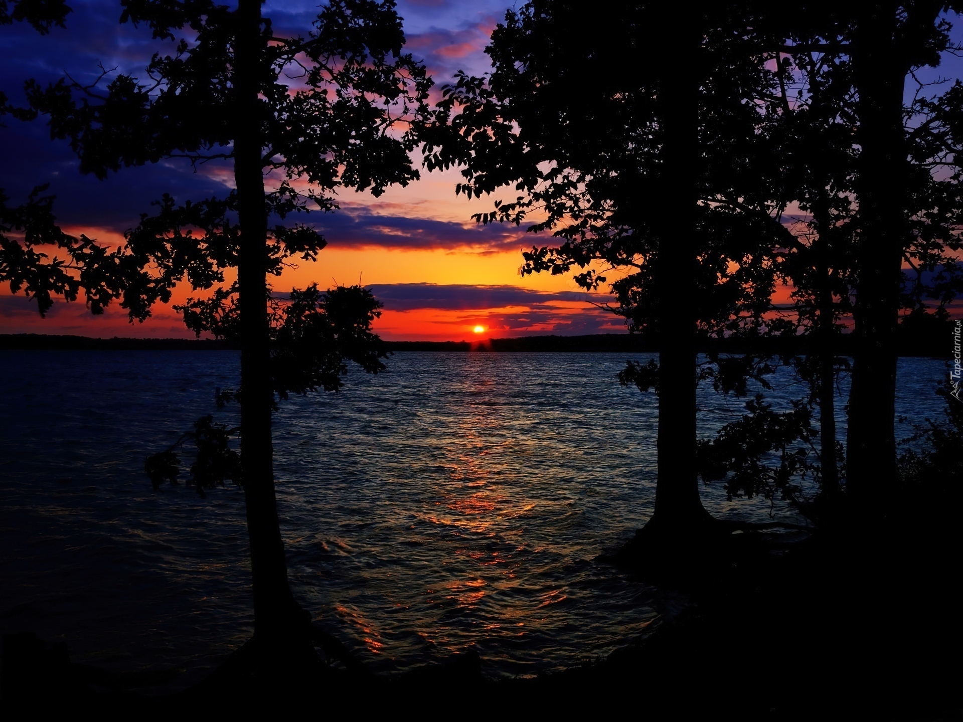 Edytor tapety: Jezioro, Drzewa, Chmury, Zachód Słońca