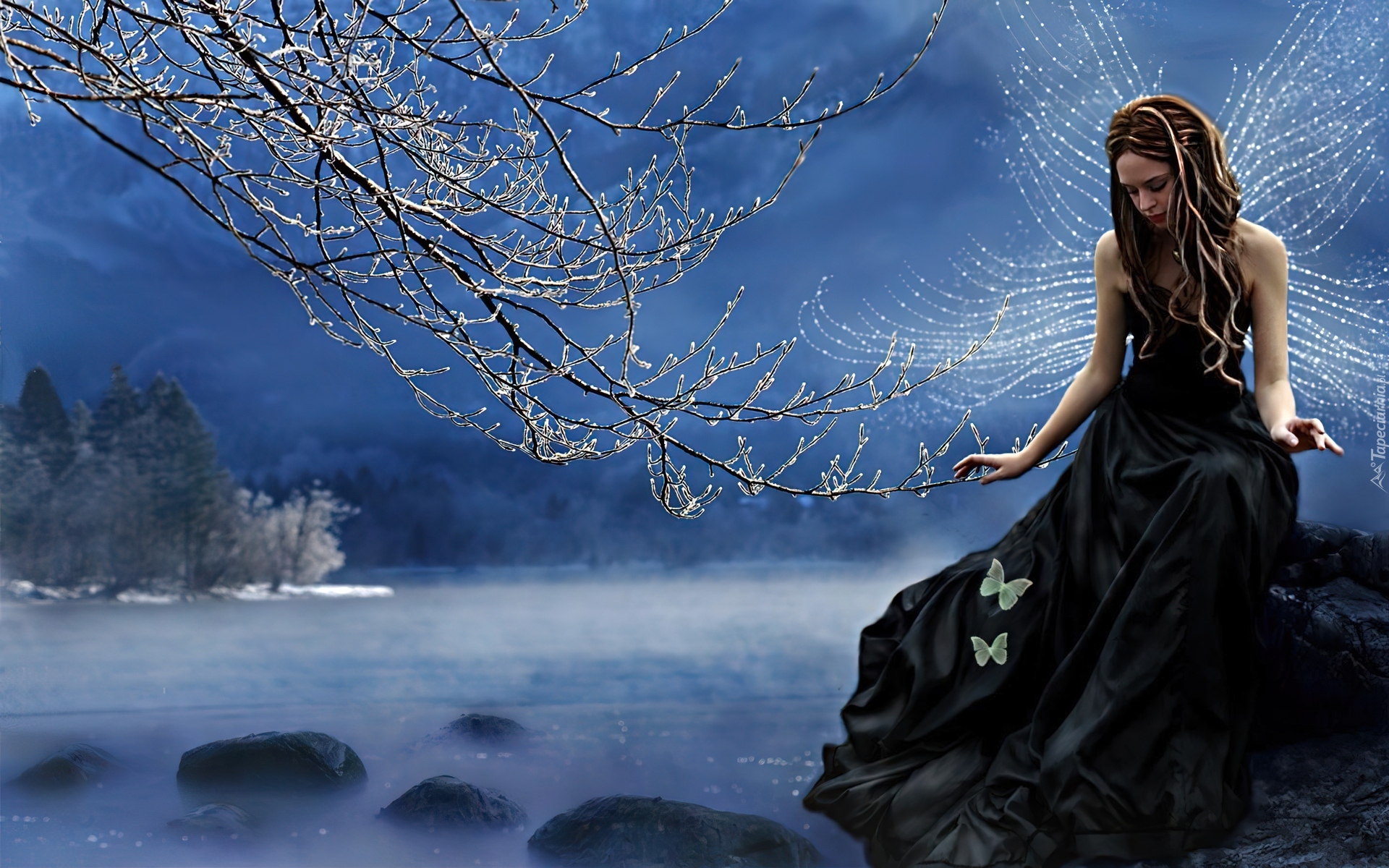 Edytor tapety: Grafika, Kobieta, Motyl, Rzeka, Drzewa