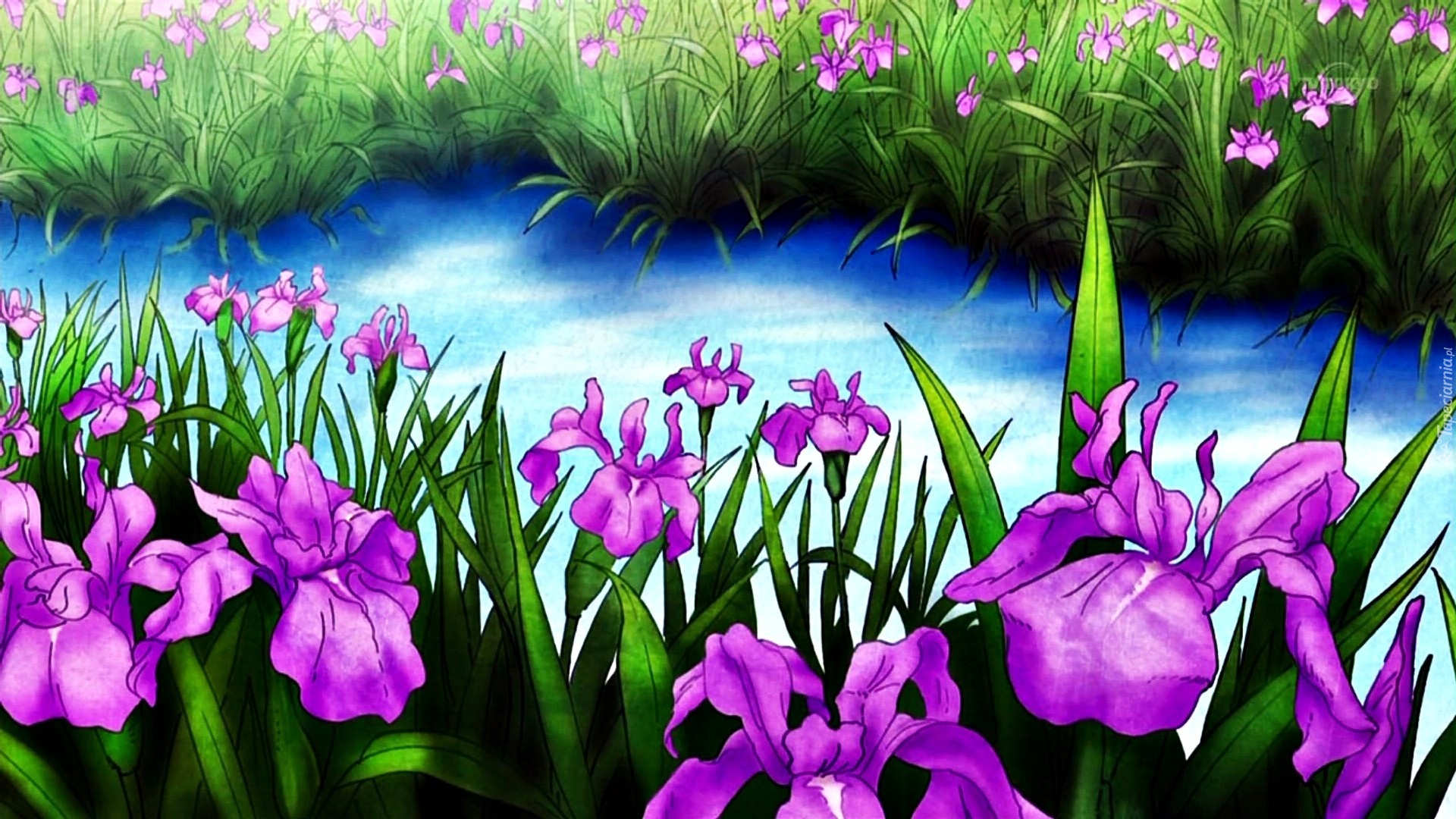 Edytor tapety: Fioletowe, Kwiaty, Strumyk