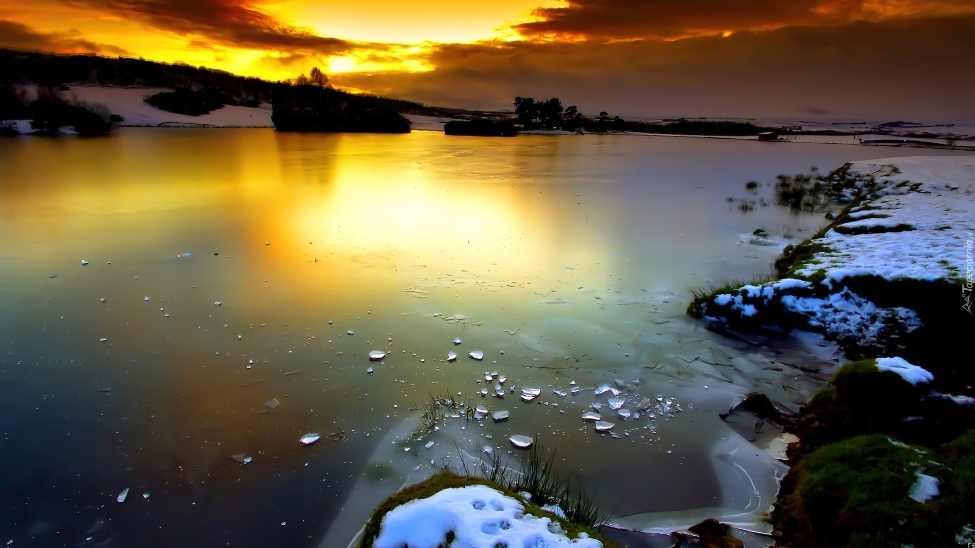 Edytor tapety: Jeziora, Wybrzeża, Zachody, Słońca, Śnieg, Zima