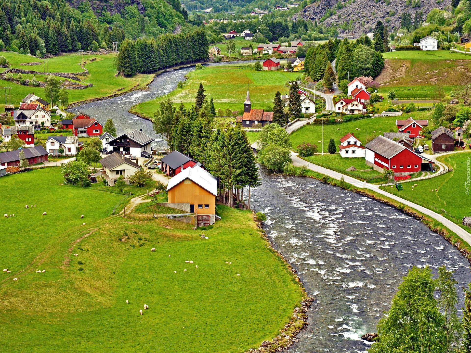 Edytor tapety: Rzeka, Łąki, Domy, Norwegia