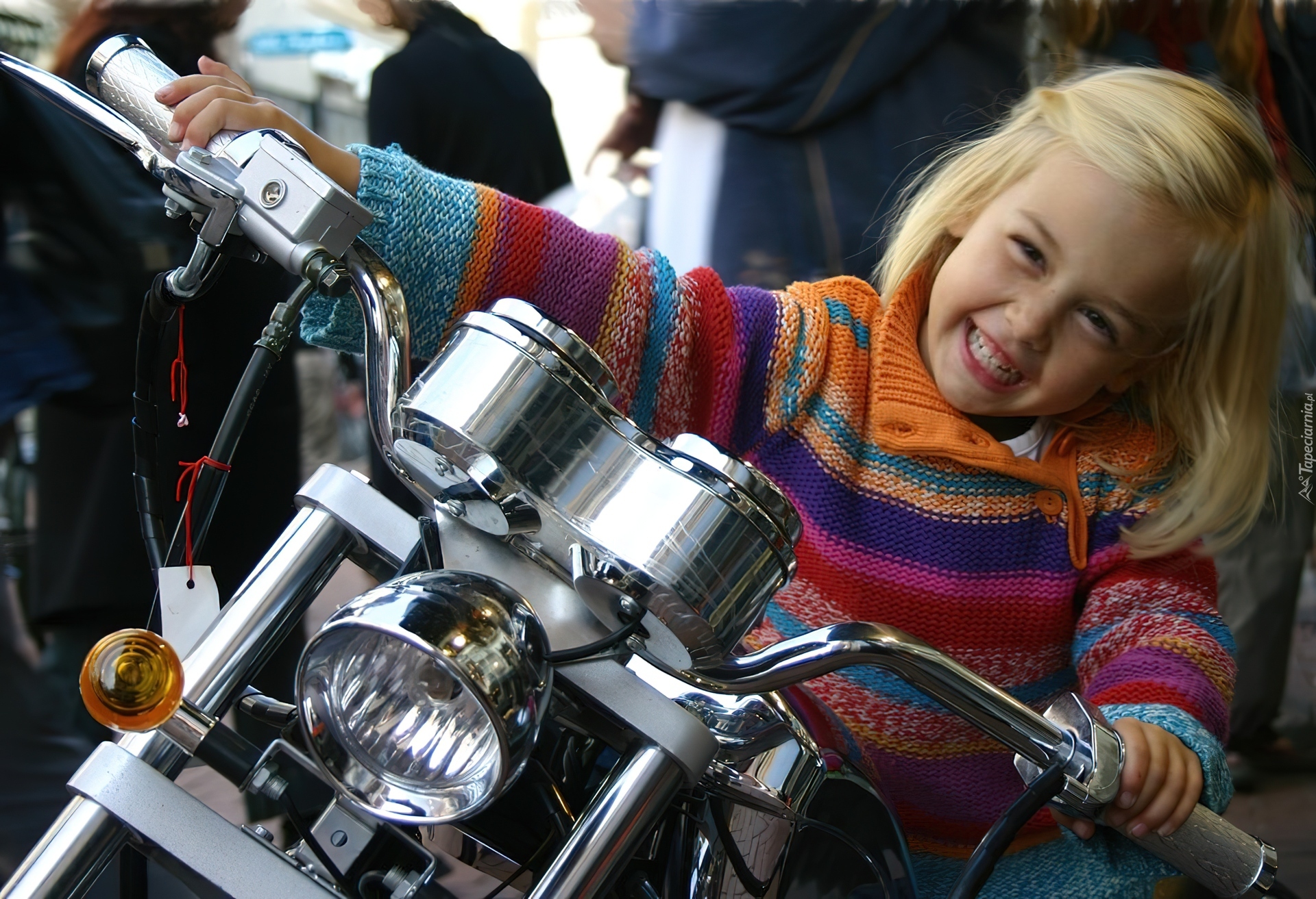 Edytor tapety: Dziewczynka, Uśmiech, Zabawa, Motocykl, Humor