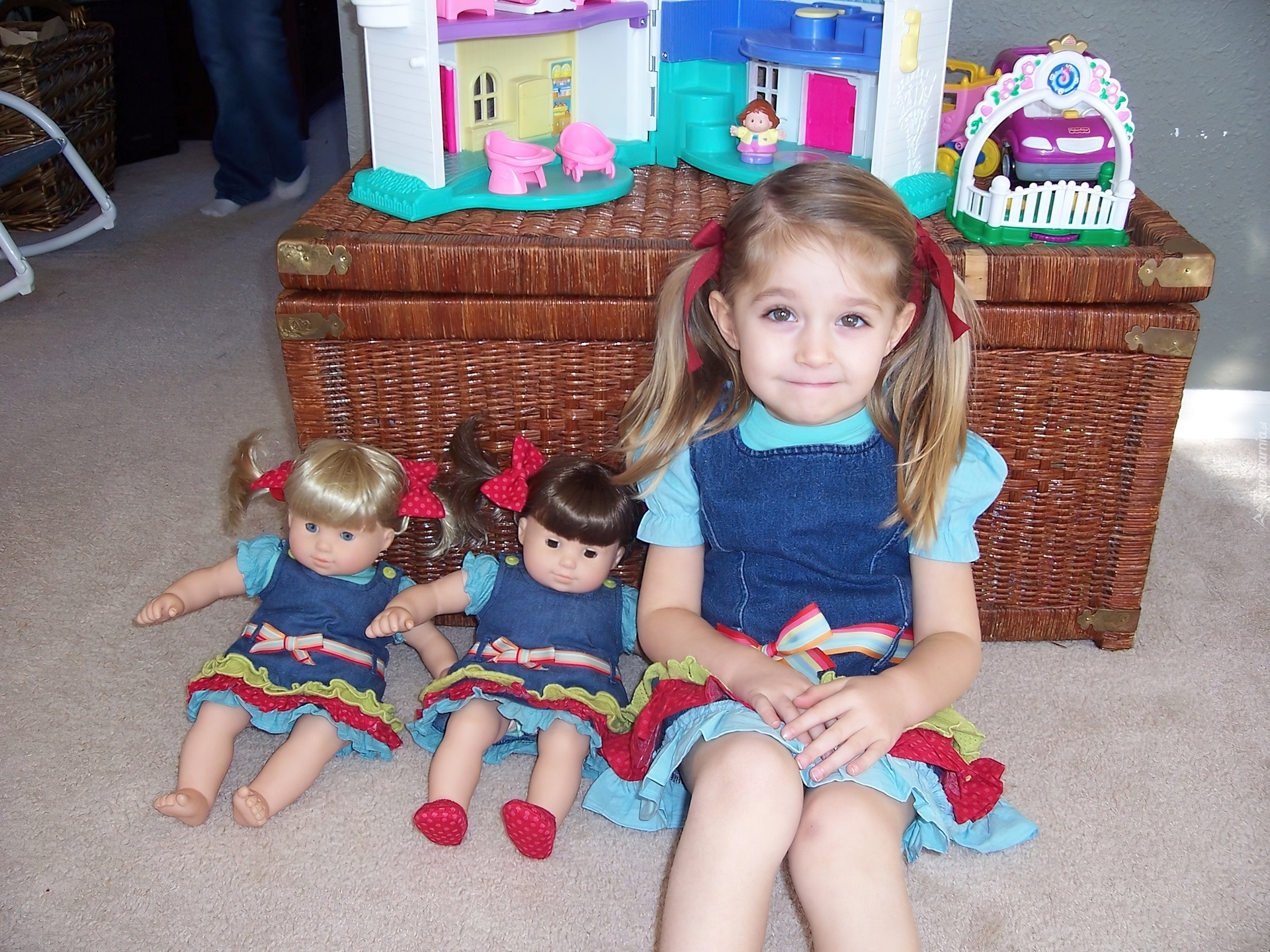 Edytor tapety: Dziewczynka, Uśmiech, Kitki, Zabawki, Lalki, Sukienki