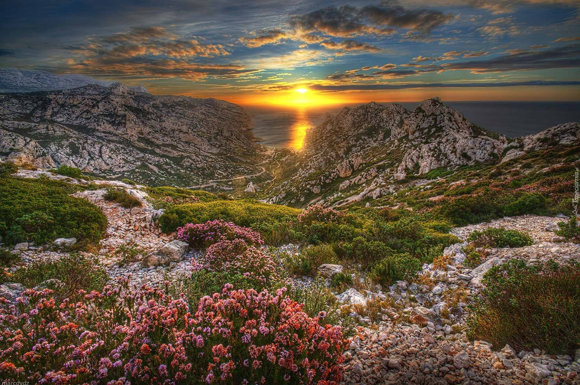 Edytor tapety: Zachód, Słońca, Skały, Rośliny