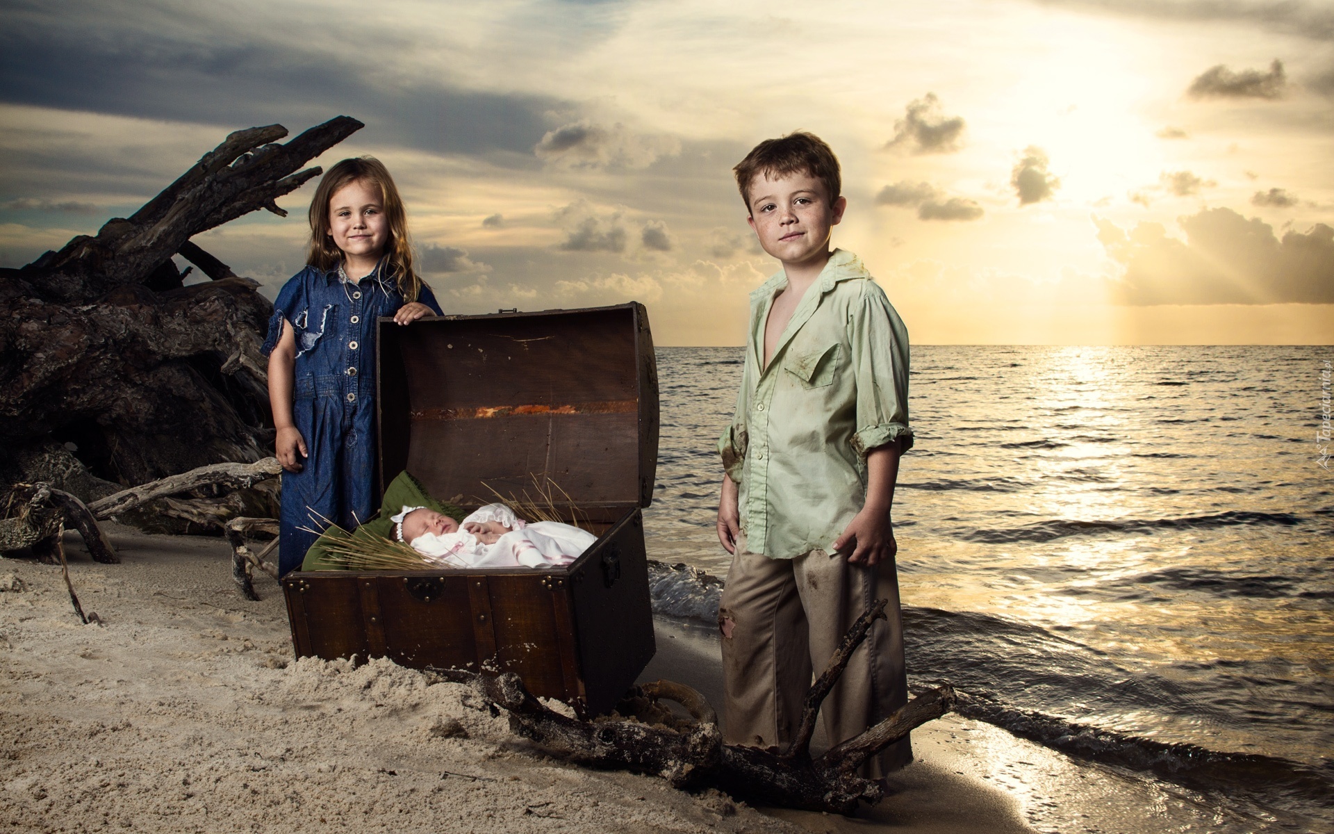 Edytor tapety: Dziewczynka, Chłopiec, Kufer, Niemowlę