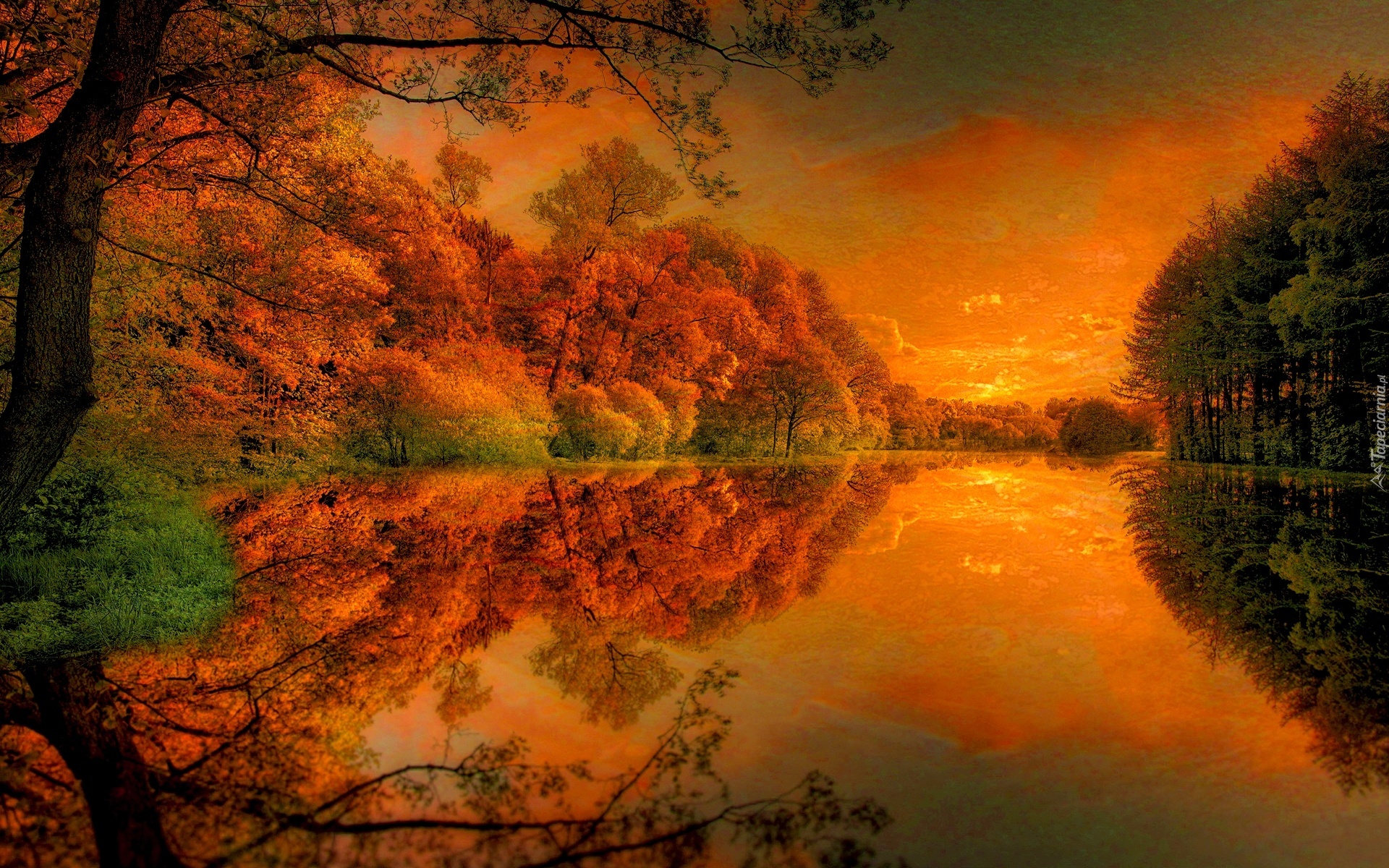Edytor tapety: Zachód, Słońca, Rzeka, Drzewa, Jesień