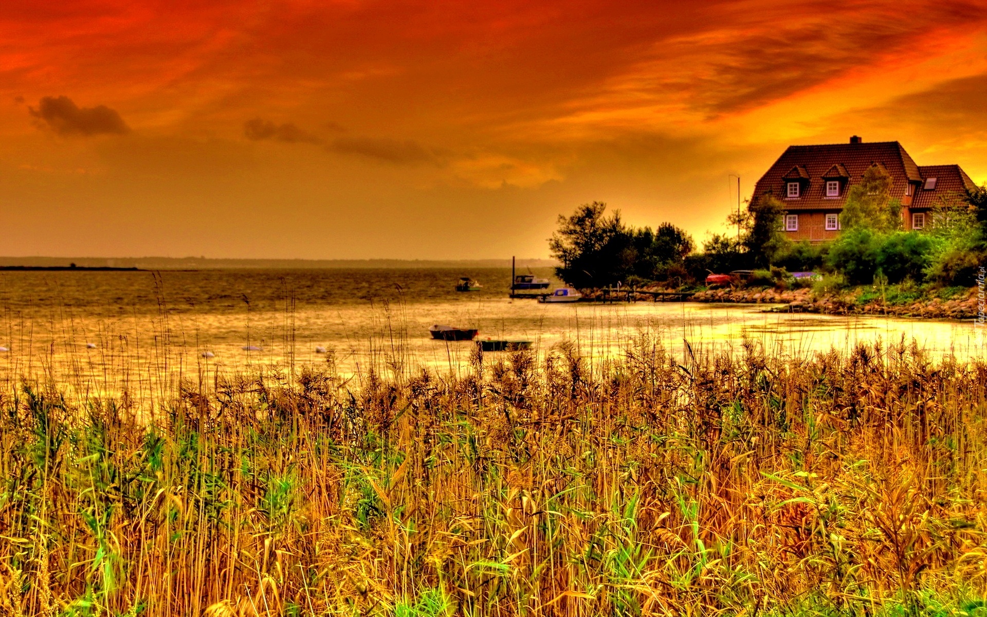Edytor tapety: Zachód, Słońca, Jezioro, Trawa, Dom