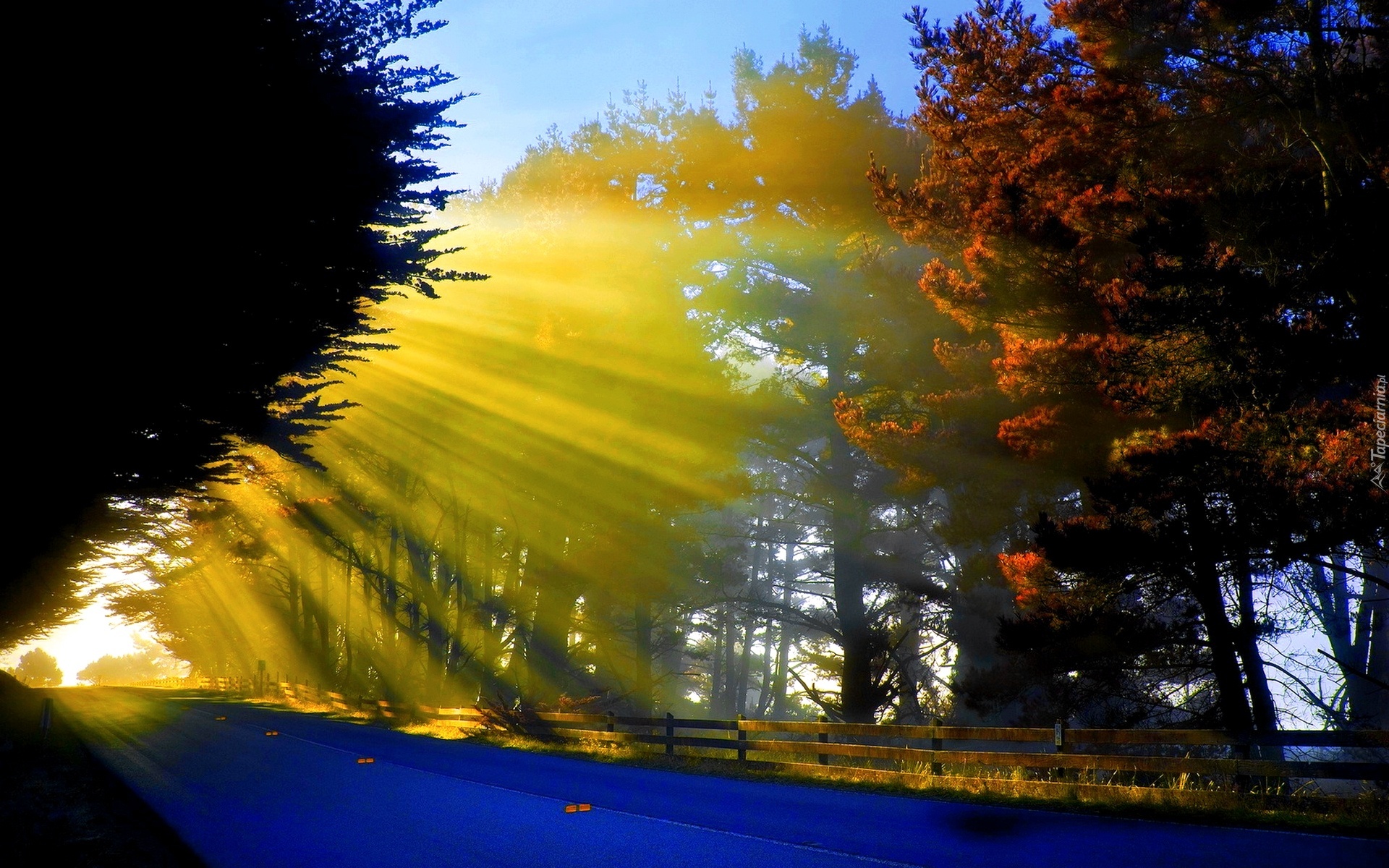 Edytor tapety: Promienie, Słońca, Drzewa, Droga