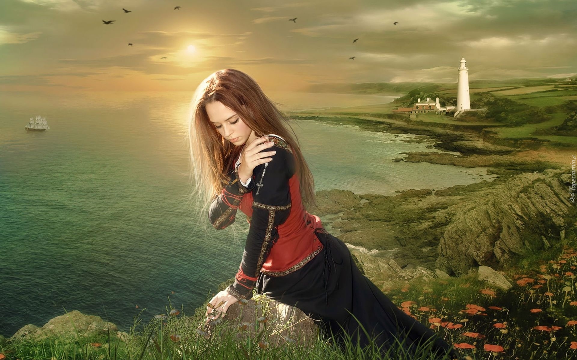 Edytor tapety: Kobieta, Morze, Latarnia Morska